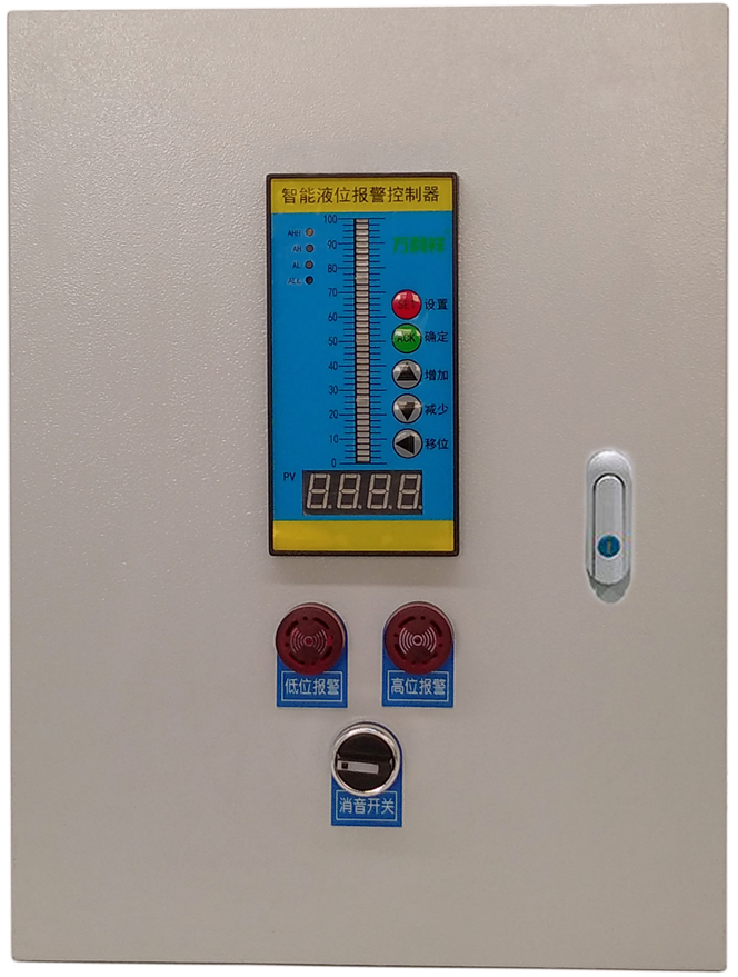 智能液位报警控制器将液位信息以数字形式在数码管上显示以及LED光柱百分比显示。当液位超过设定值时立即触发对应继电器动作,进行抽水/排水/报警等。金属基业箱安装。