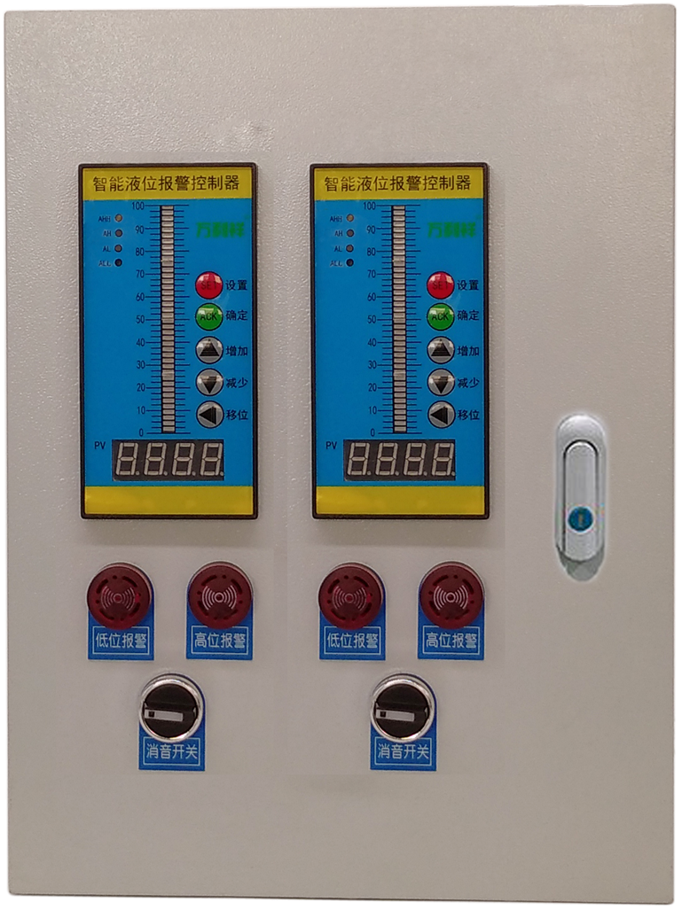 智能液位报警控制器将液位信息以数字形式在数码管上显示以及LED光柱百分比显示。当液位超过设定值时立即触发对应继电器动作,进行抽水/排水/报警等。金属基业箱安装。