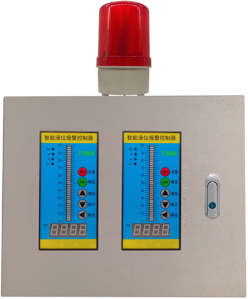 智能液位报警控制器将液位信息以数字形式在数码管上显示以及LED光柱百分比显示。当液位超过设定值时立即触发语音播报且对应继电器动作,进行抽水/排水/报警等。金属基业箱安装。