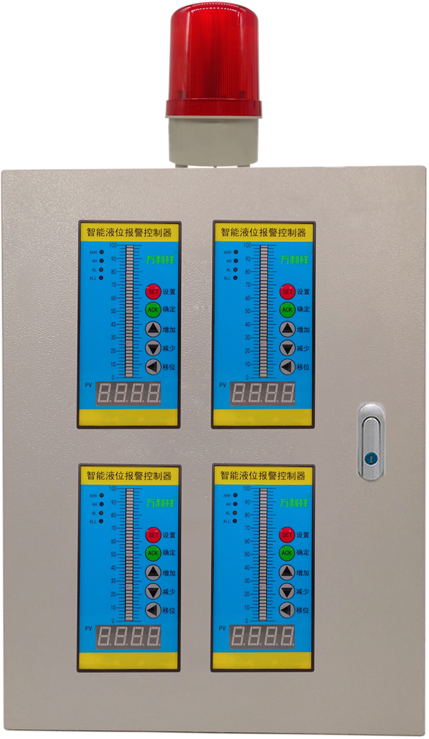智能液位报警控制器将液位信息以数字形式在数码管上显示以及LED光柱百分比显示。当液位超过设定值时立即触发语音播报且对应继电器动作,进行抽水/排水/报警等。金属基业箱安装。