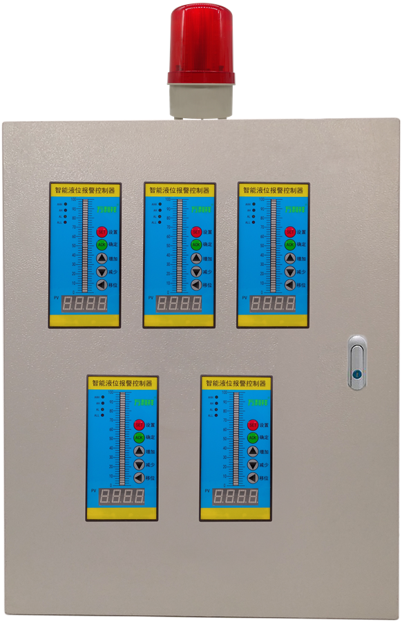 智能液位报警控制器将液位信息以数字形式在数码管上显示以及LED光柱百分比显示。当液位超过设定值时立即触发语音播报且对应继电器动作,进行抽水/排水/报警等。金属基业箱安装。