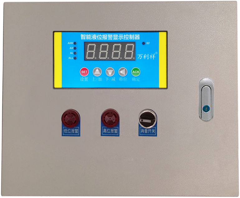 智能液位报警显示控制器将液位信息以数字形式在数码管上显示。当液位超过设定值时立即触发对应继电器动作,进行抽水/排水/报警等。金属基业箱安装。