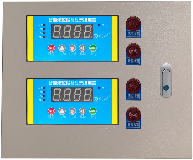 智能液位报警显示控制器将液位信息以数字形式在数码管上显示。当液位超过设定值时立即触发对应继电器动作,进行抽水/排水/报警等。金属基业箱安装。