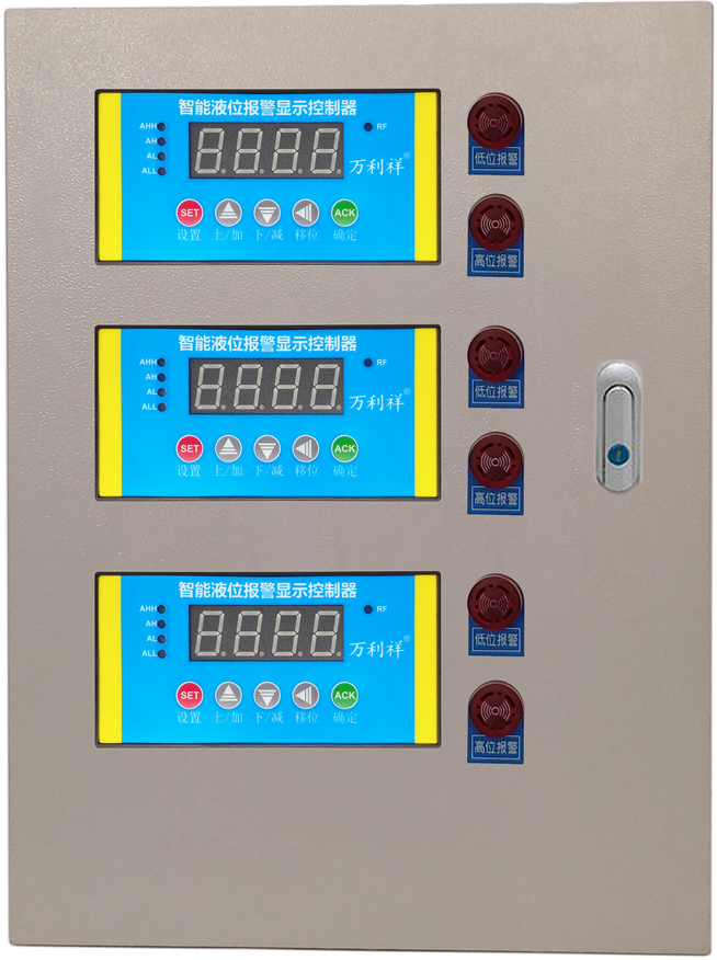 智能液位报警显示控制器将液位信息以数字形式在数码管上显示。当液位超过设定值时立即触发对应继电器动作,进行抽水/排水/报警等。金属基业箱安装。