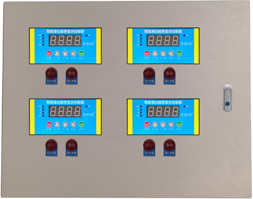 智能液位报警显示控制器将液位信息以数字形式在数码管上显示。当液位超过设定值时立即触发对应继电器动作,进行抽水/排水/报警等。金属基业箱安装。