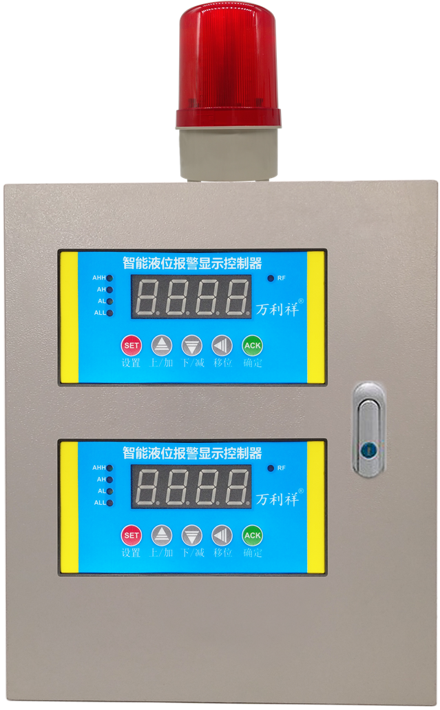 智能液位报警显示控制器作为接收端,接收无线信号进行处理判断,将液位信息以数字形式在数码管上显示。当液位超过设定值时立即触发语音播报且对应继电器动作,进行抽水/排水/报警等。金属基业箱安装。