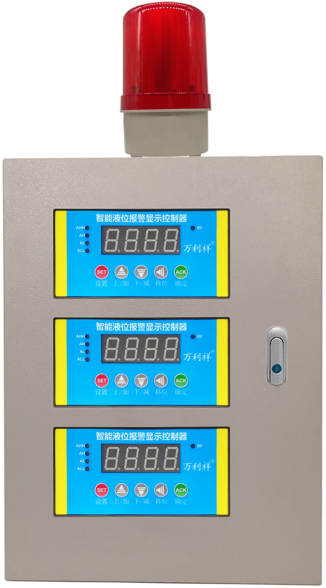 智能液位报警显示控制器作为接收端,接收无线信号进行处理判断,将液位信息以数字形式在数码管上显示。当液位超过设定值时立即触发语音播报且对应继电器动作,进行抽水/排水/报警等。金属基业箱安装。