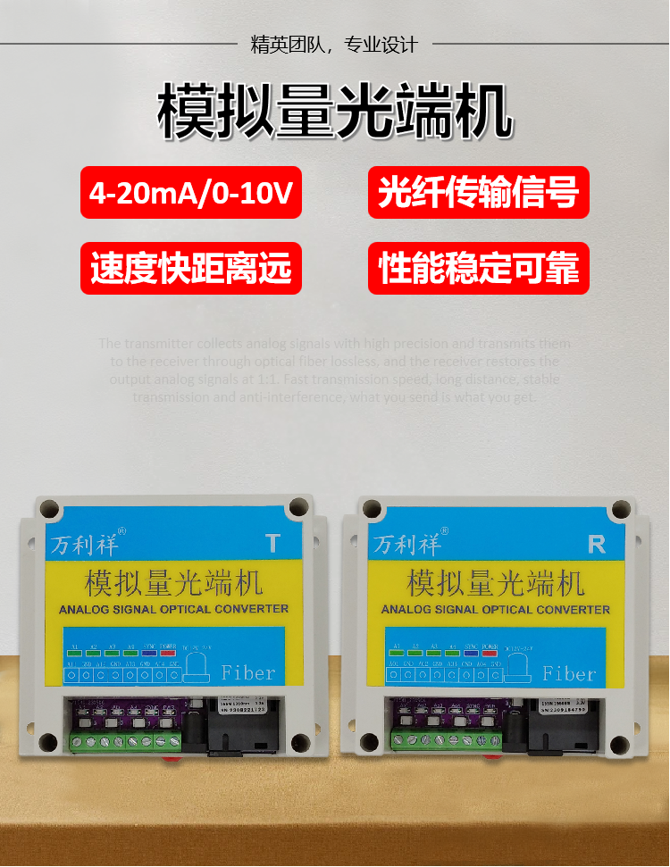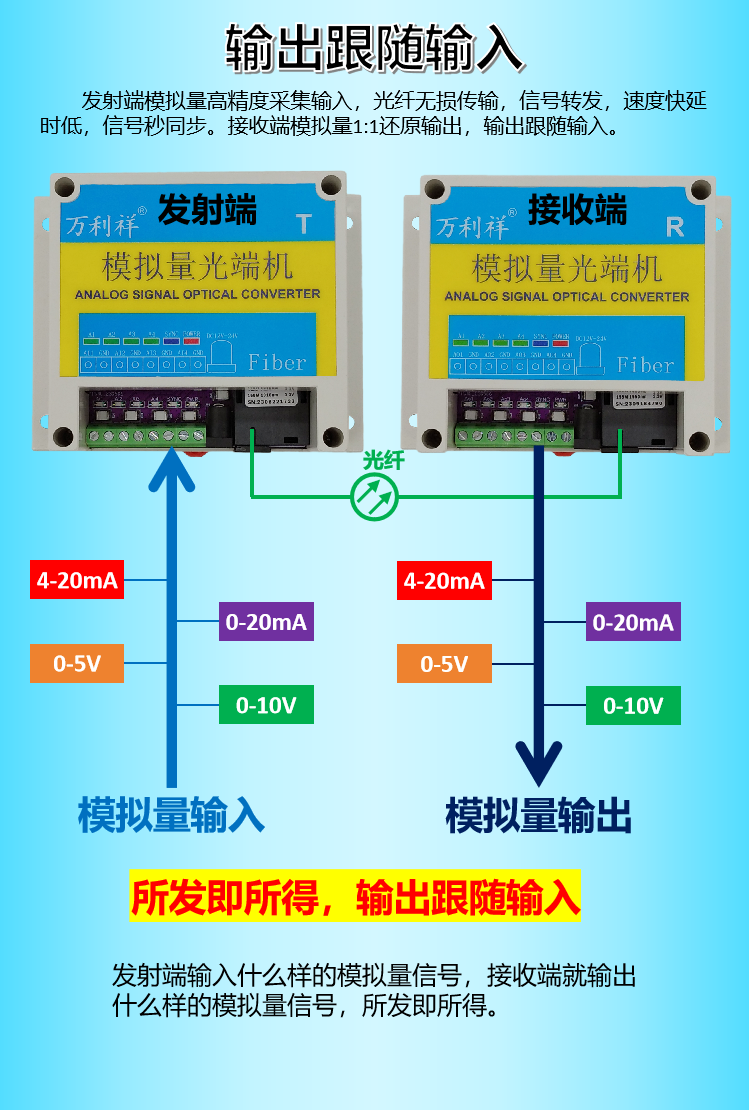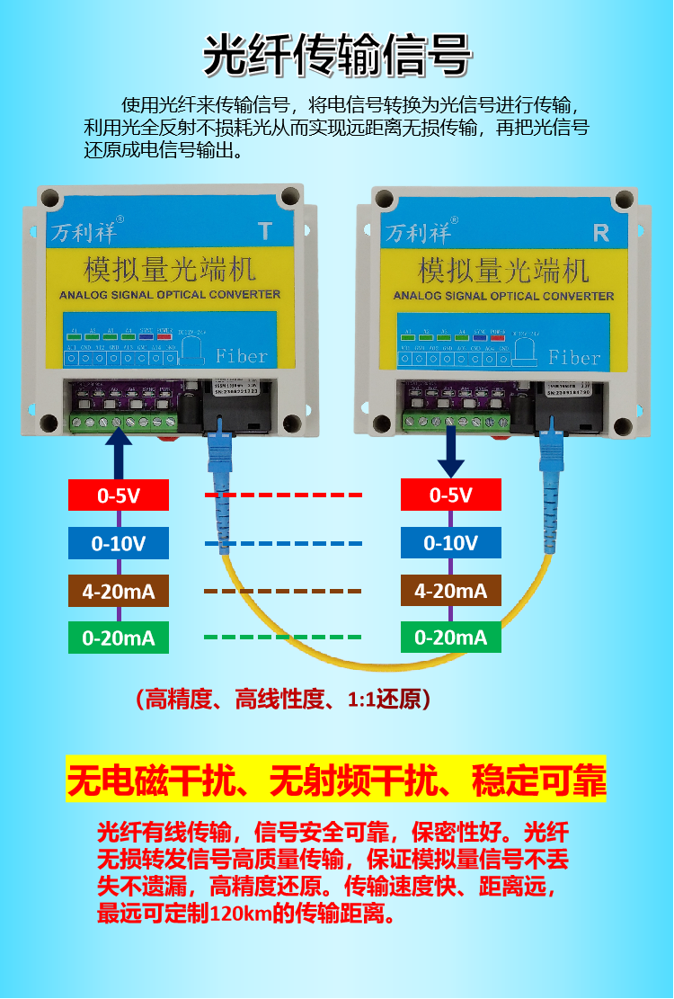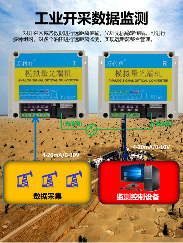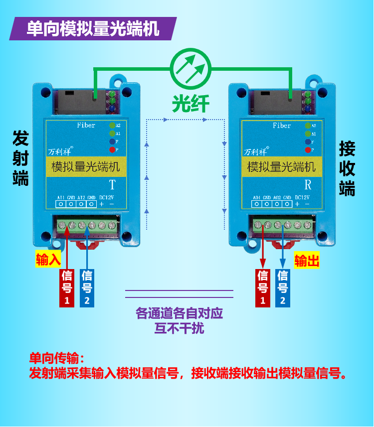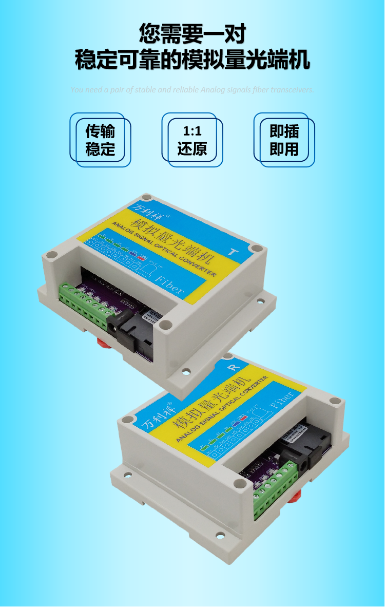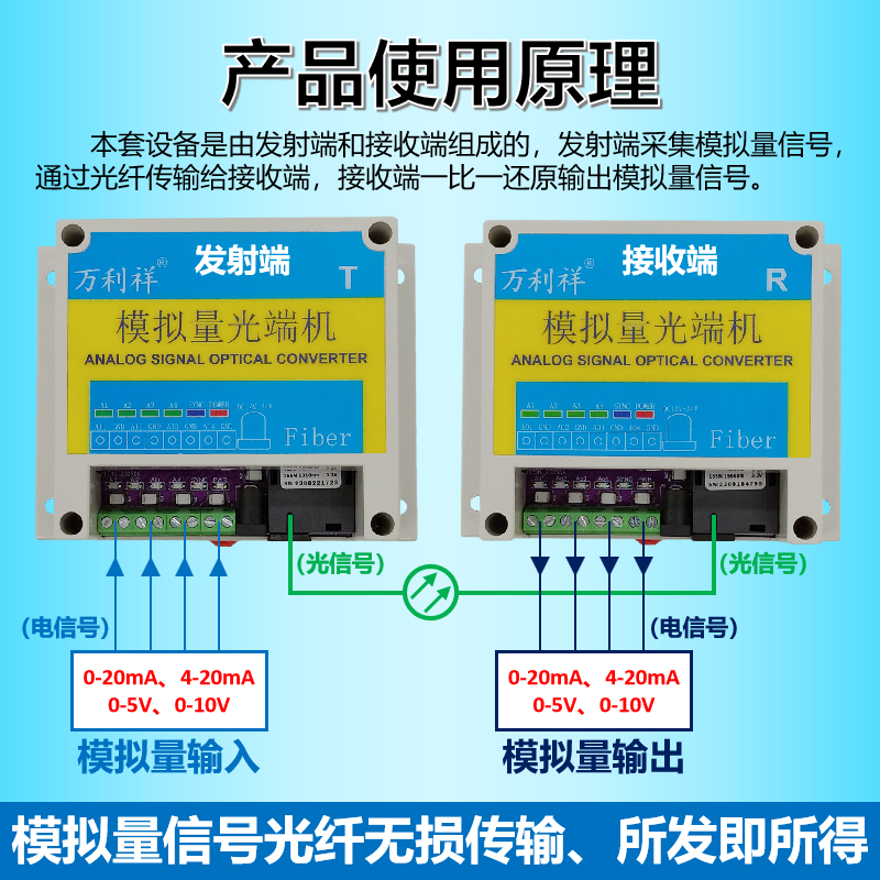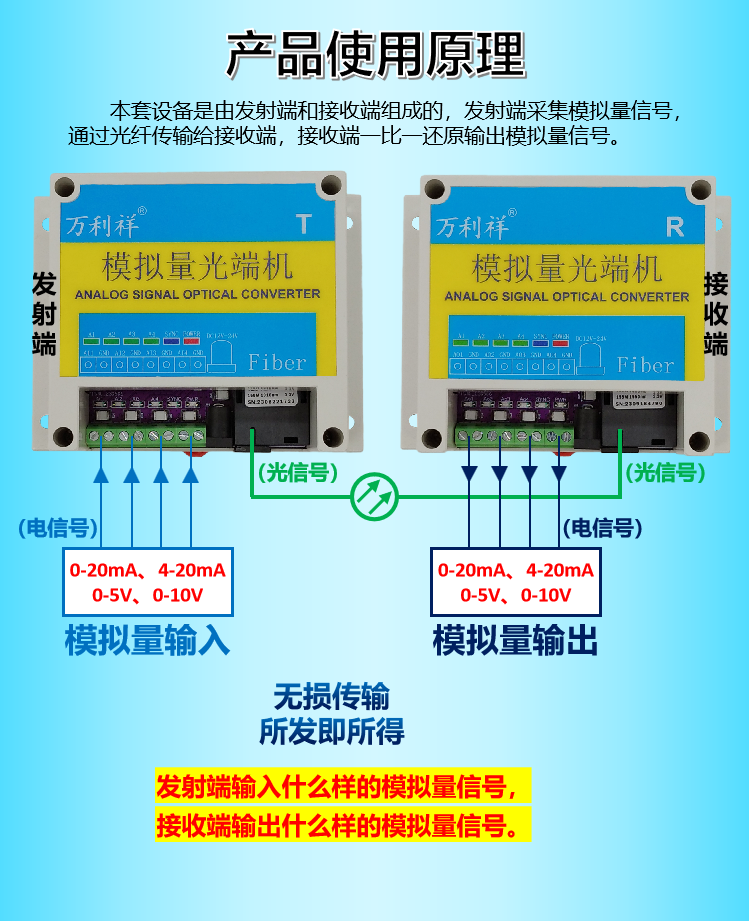 本套设备是由发射端和接收端组成的,发射端高精度采集模拟量信号,通过光纤无损远距离传输给接收端,接收端一比一还原输出模拟量信号。
