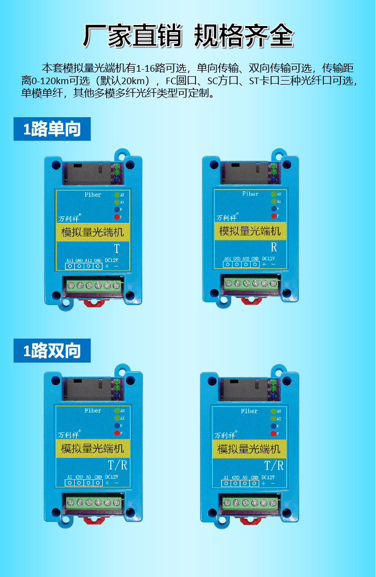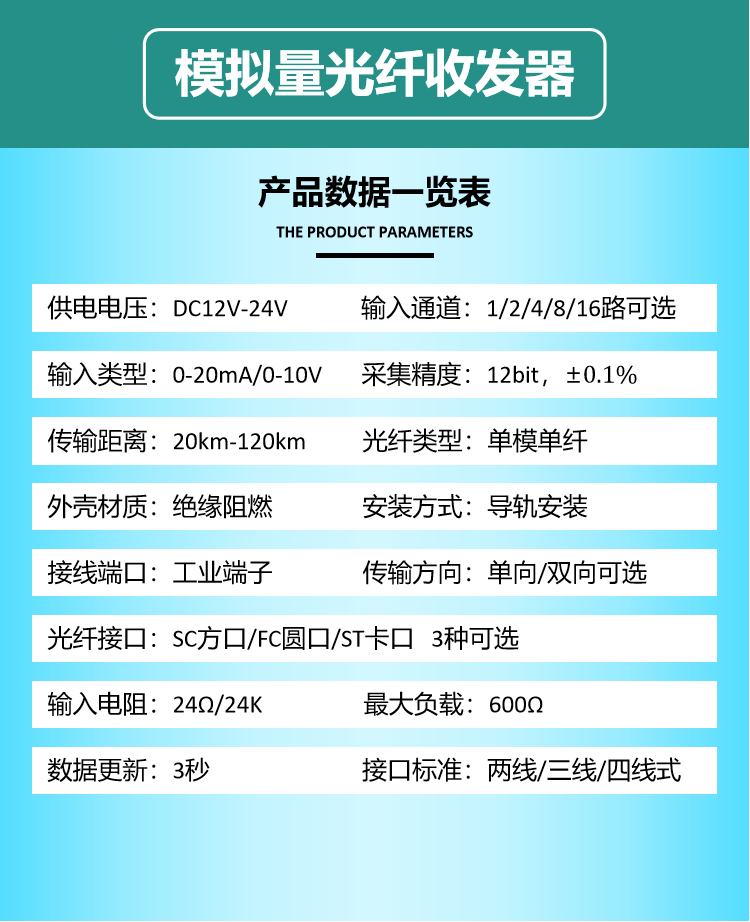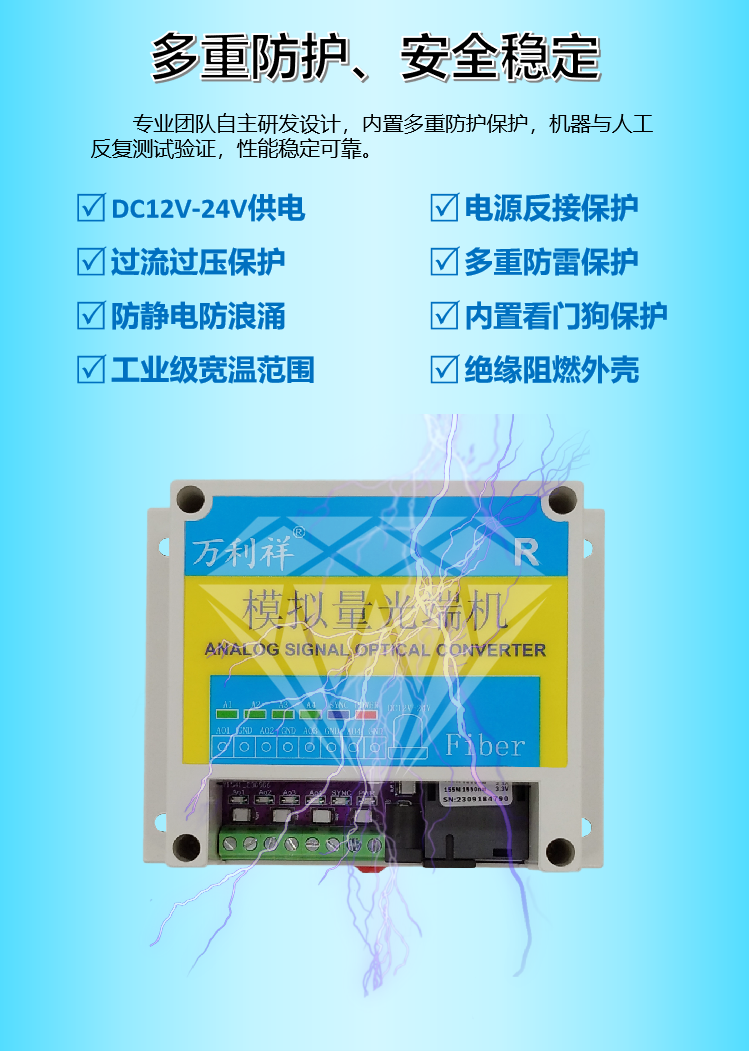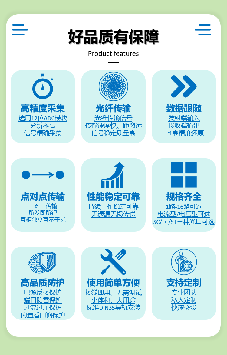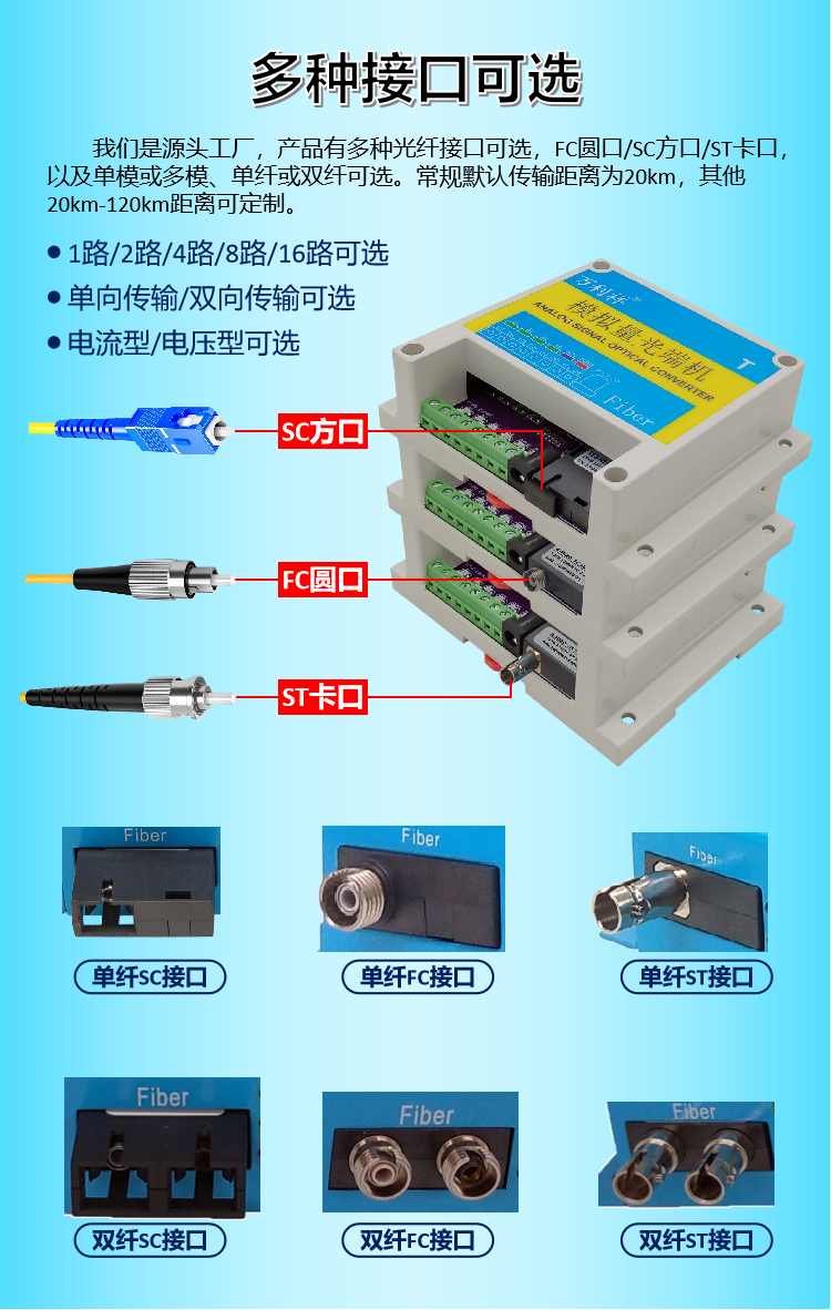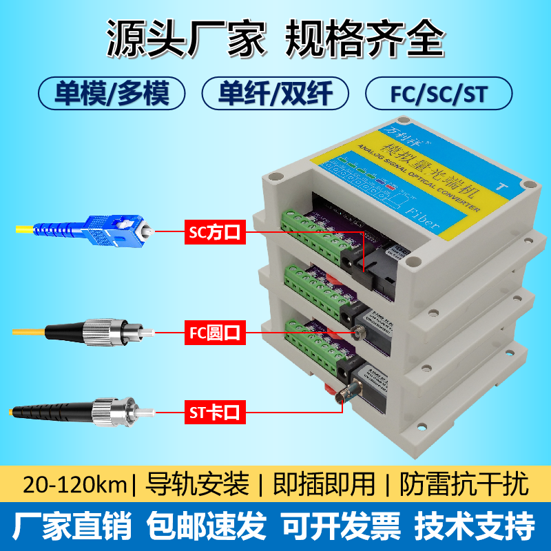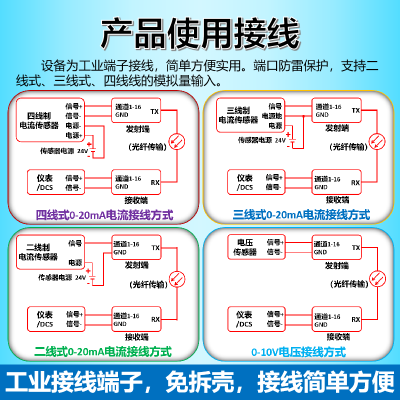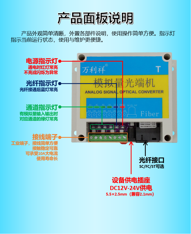 本套设备是由发射端和接收端组成的,发射端高精度采集模拟量信号,通过光纤无损远距离传输给接收端,接收端一比一还原输出模拟量信号。
