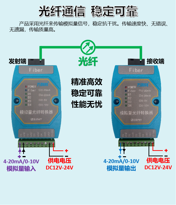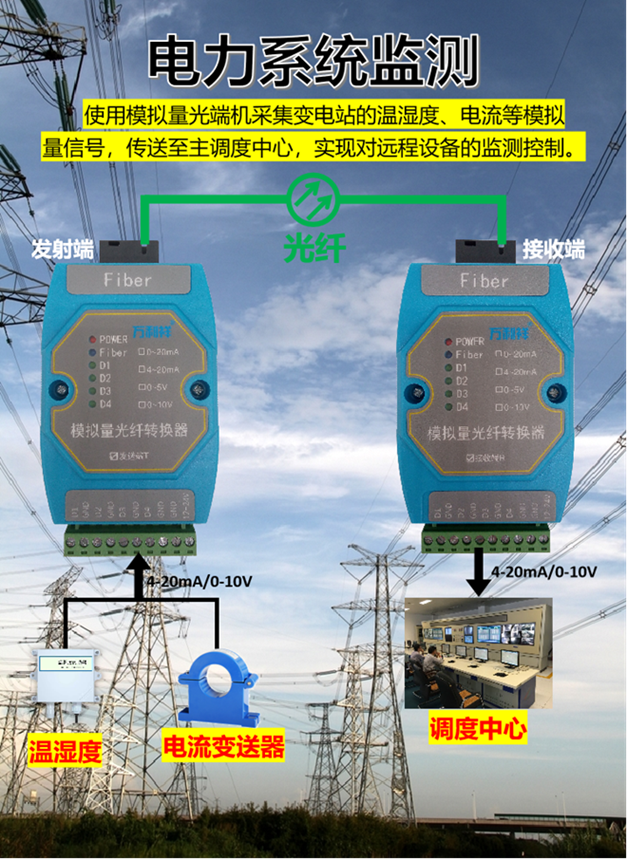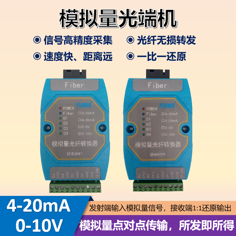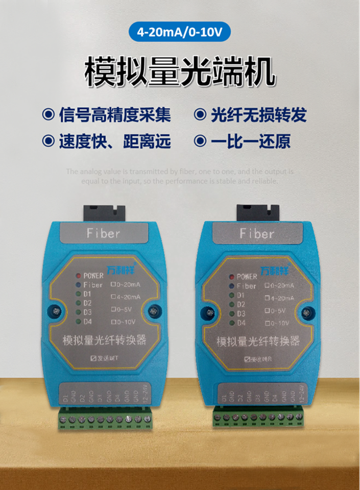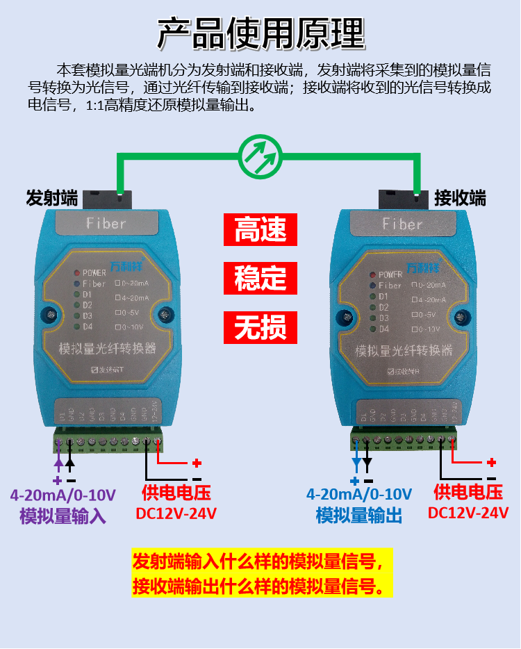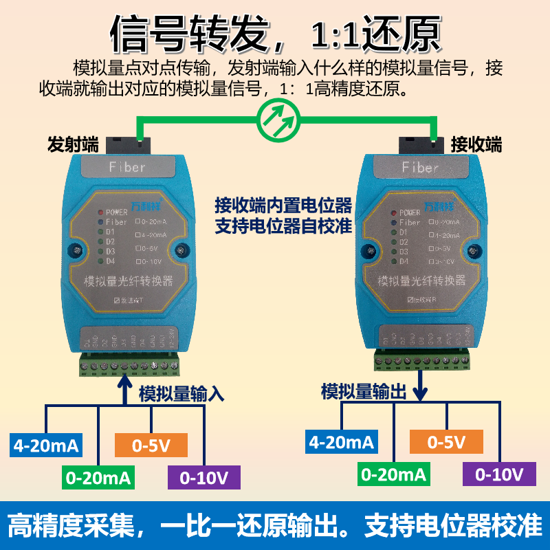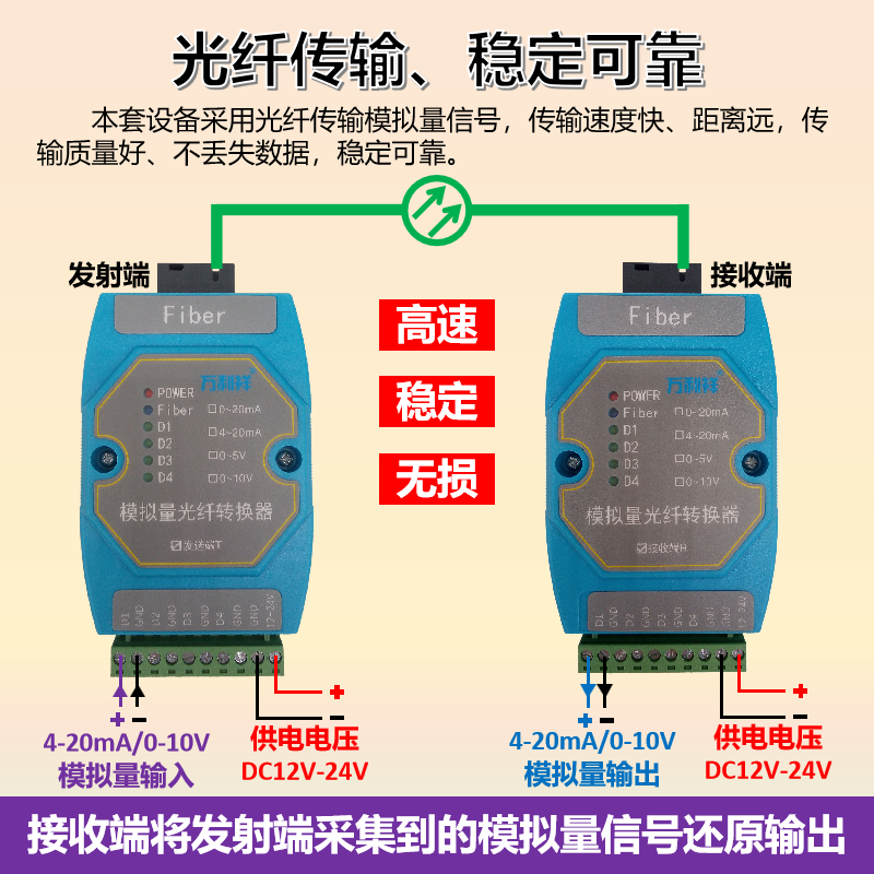 本套设备是由发射端和接收端组成的,发射端高精度采集模拟量信号,通过光纤无损远距离传输给接收端,接收端一比一还原输出模拟量信号。