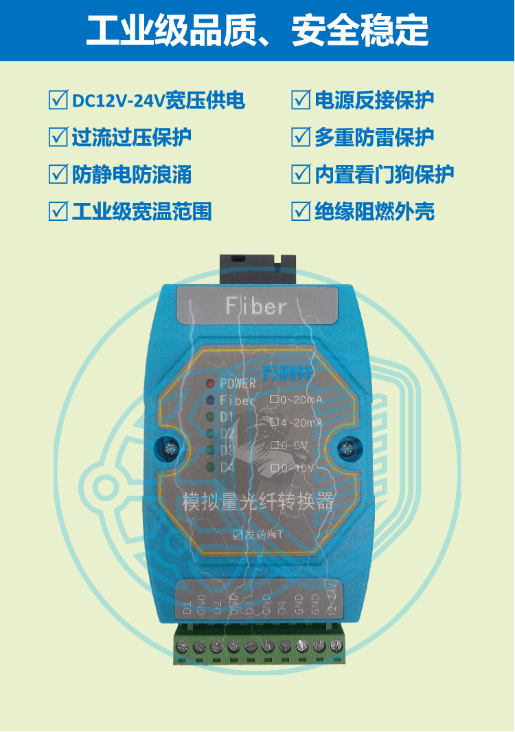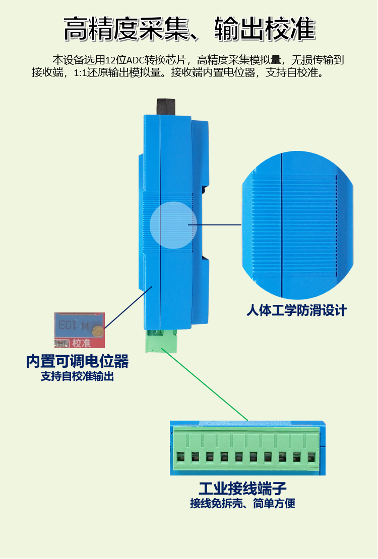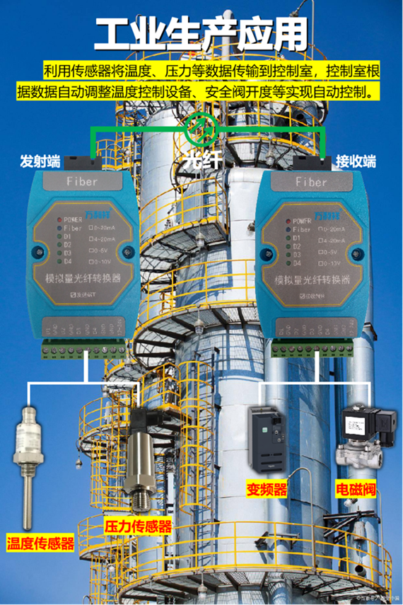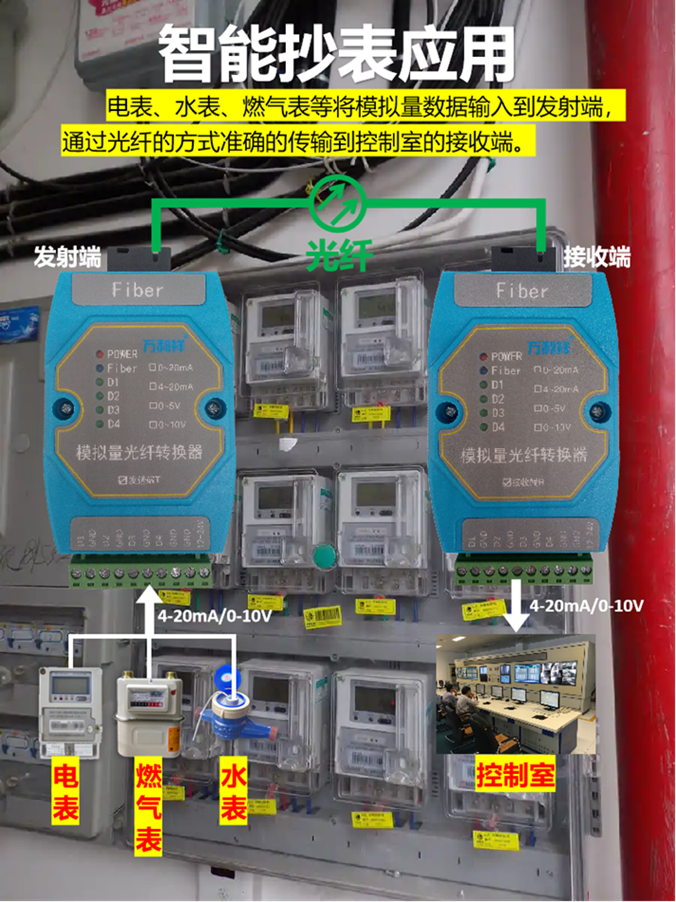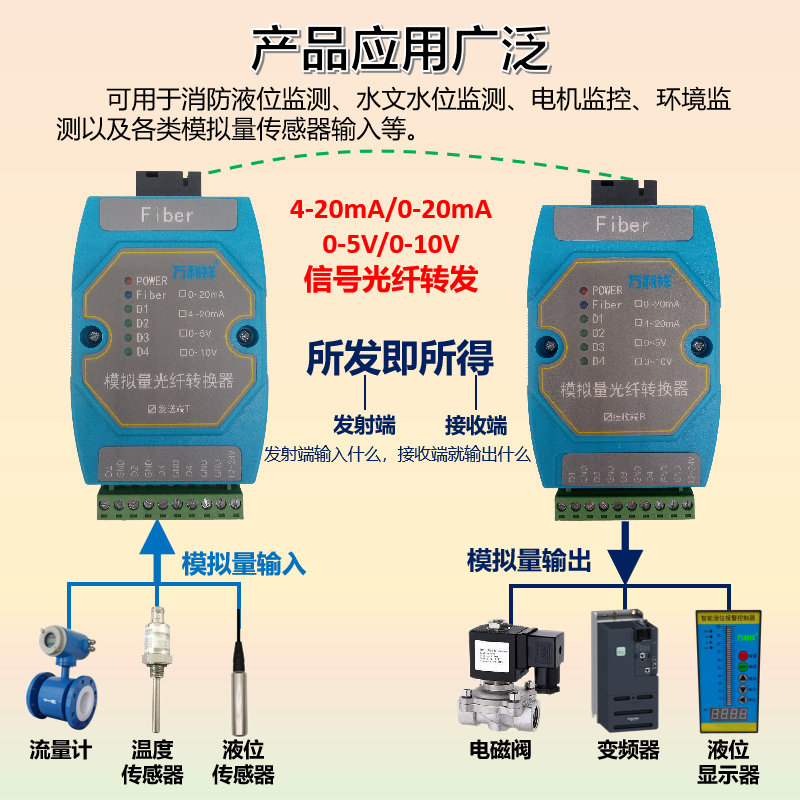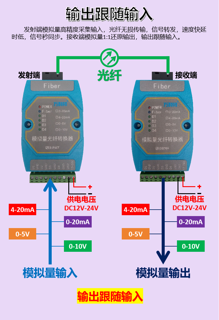 本套设备是由发射端和接收端组成的,发射端高精度采集模拟量信号,通过光纤无损远距离传输给接收端,接收端一比一还原输出模拟量信号。