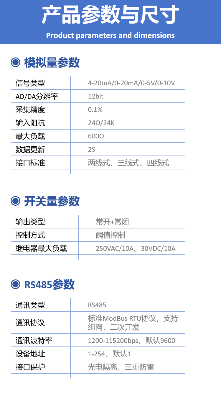 模拟量转开关量模块,当输入的模拟量大于或者小于设定的阈值时,输出端的开关就会闭合或者断开。可用按键设置各参数:阈值、开关方向、回差控制等,带数码管显示。继电器默认常开输出,最大负载可达10A。