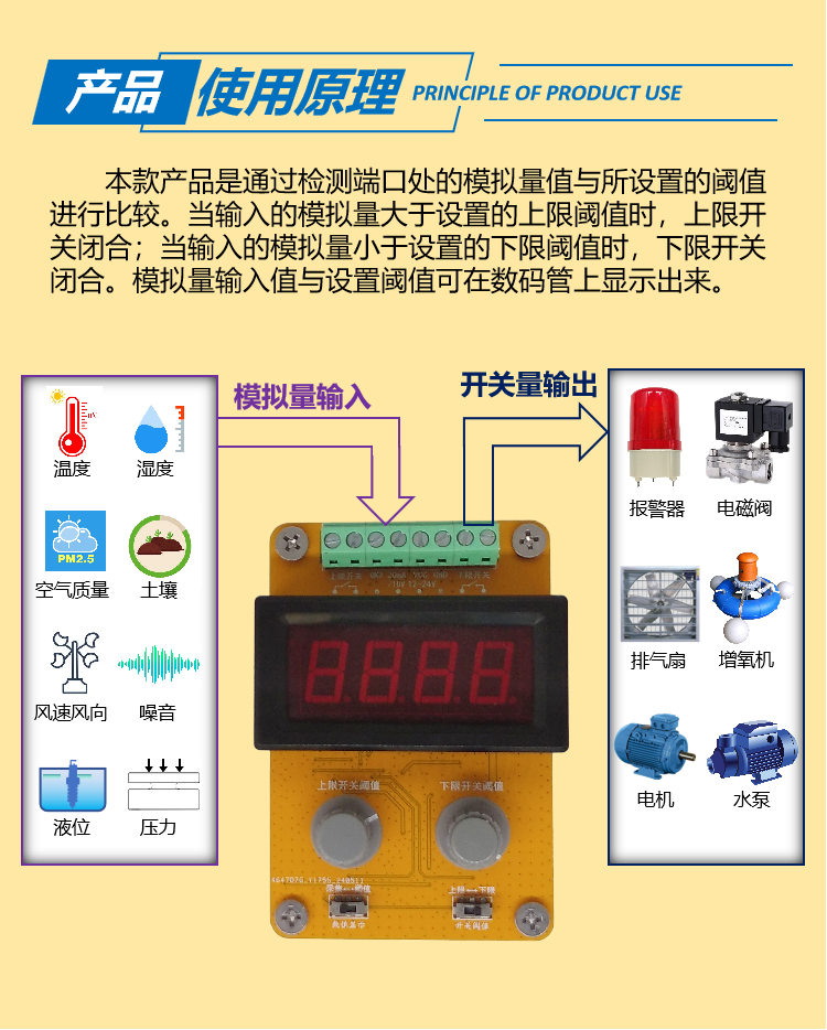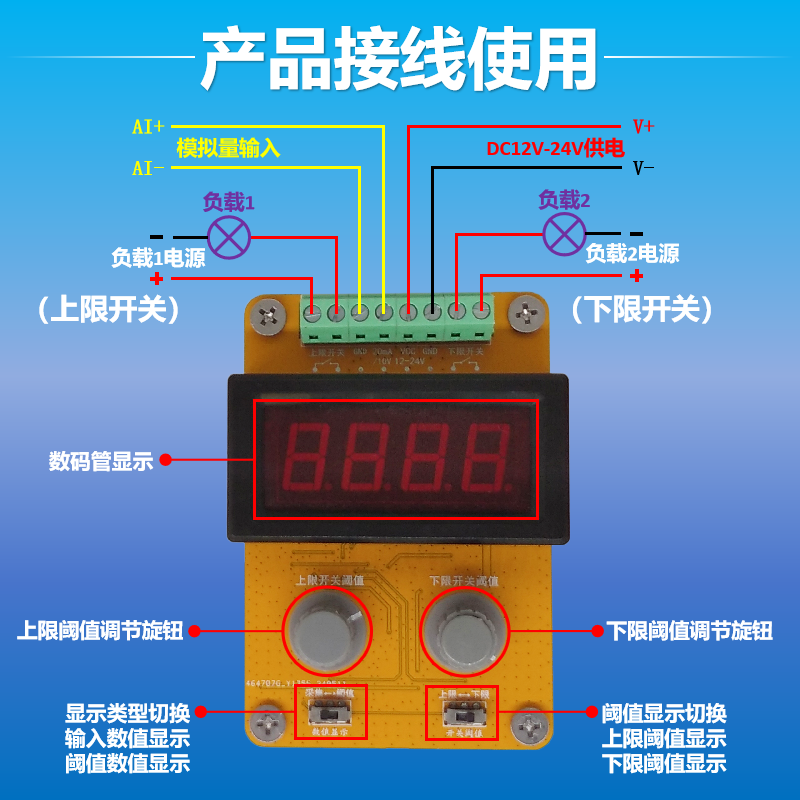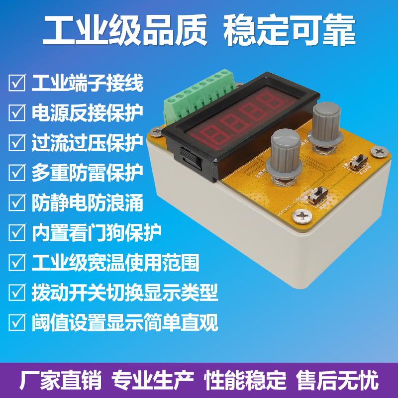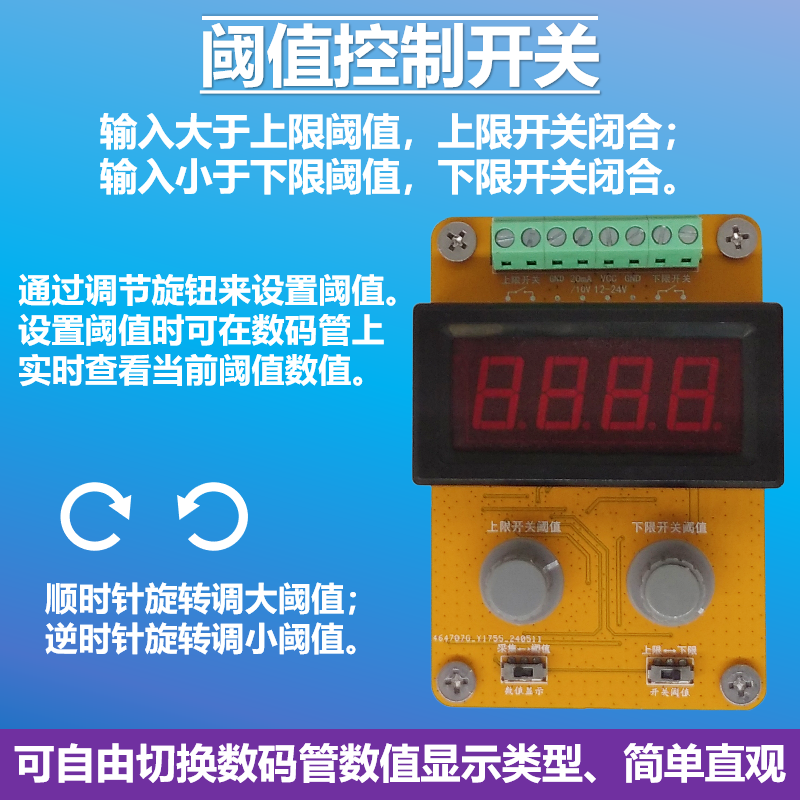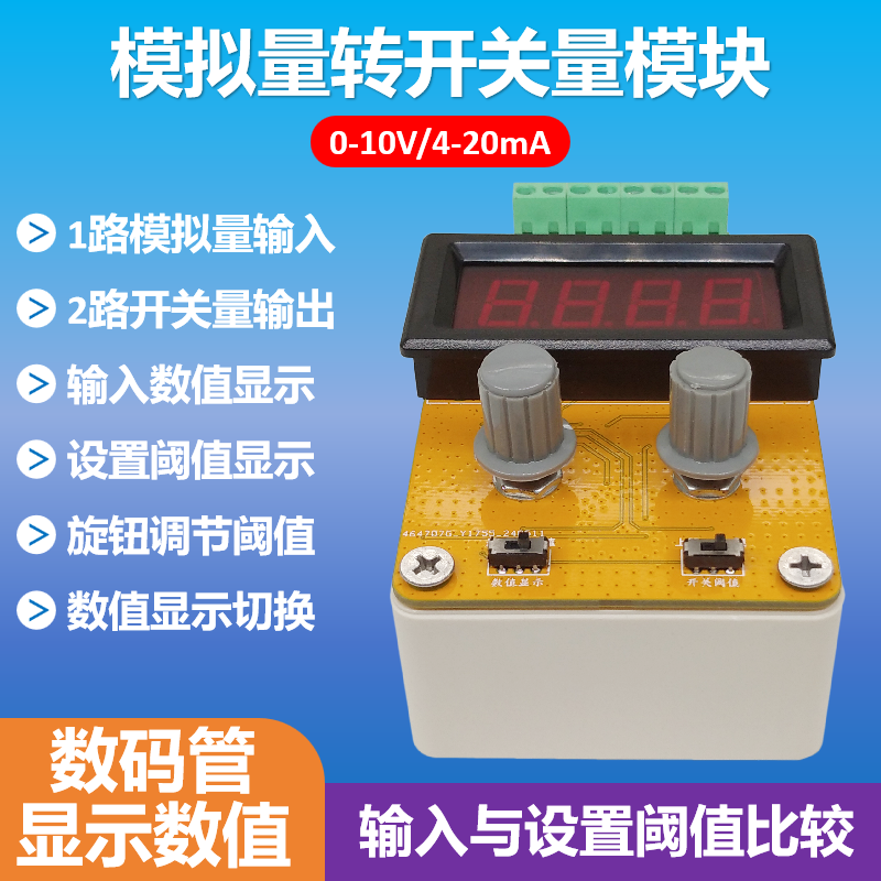 模拟量转开关量模块,当输入的模拟量大于或者小于设定的阈值时,输出端的开关就会闭合或者断开。可用旋钮设置阈值,带数码管显示,拨码开关切换输入值和设置阈值,拨码开关切换输入类型,支持0-20mA和0-10V模拟输入,继电器默认常开输出,最大负载可达10A。