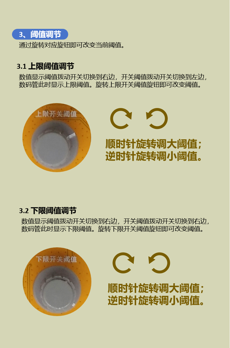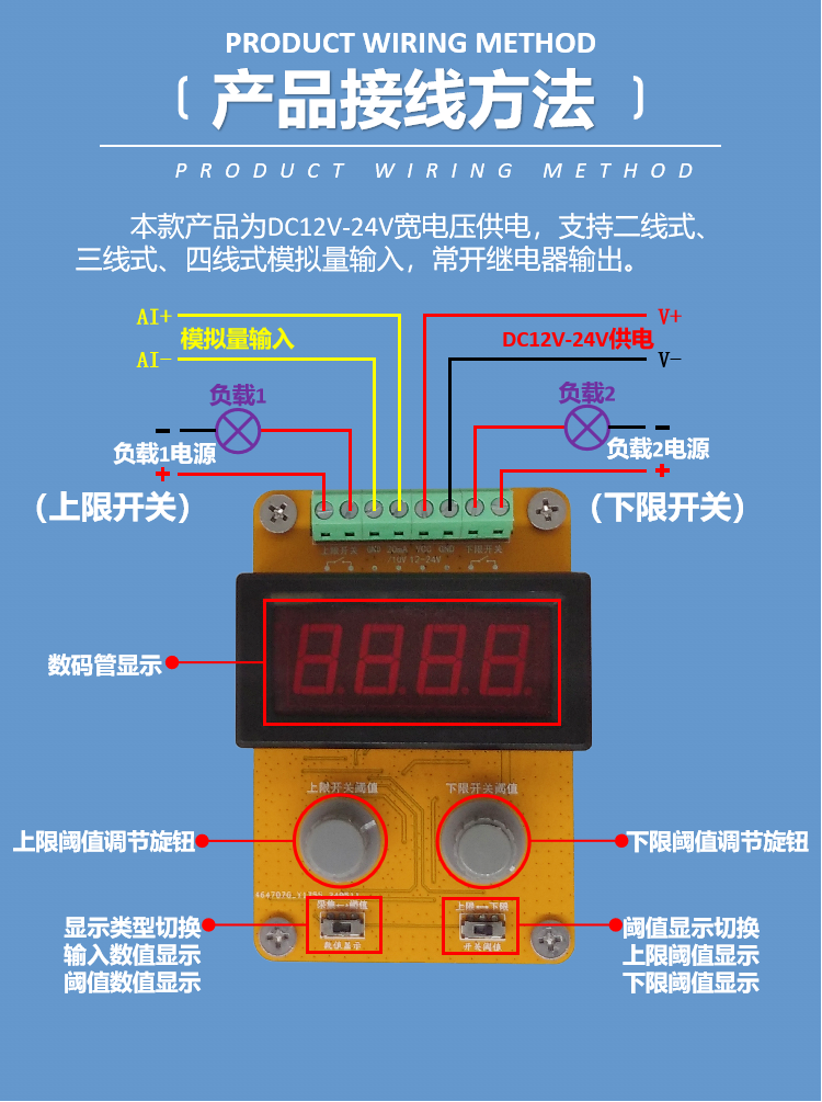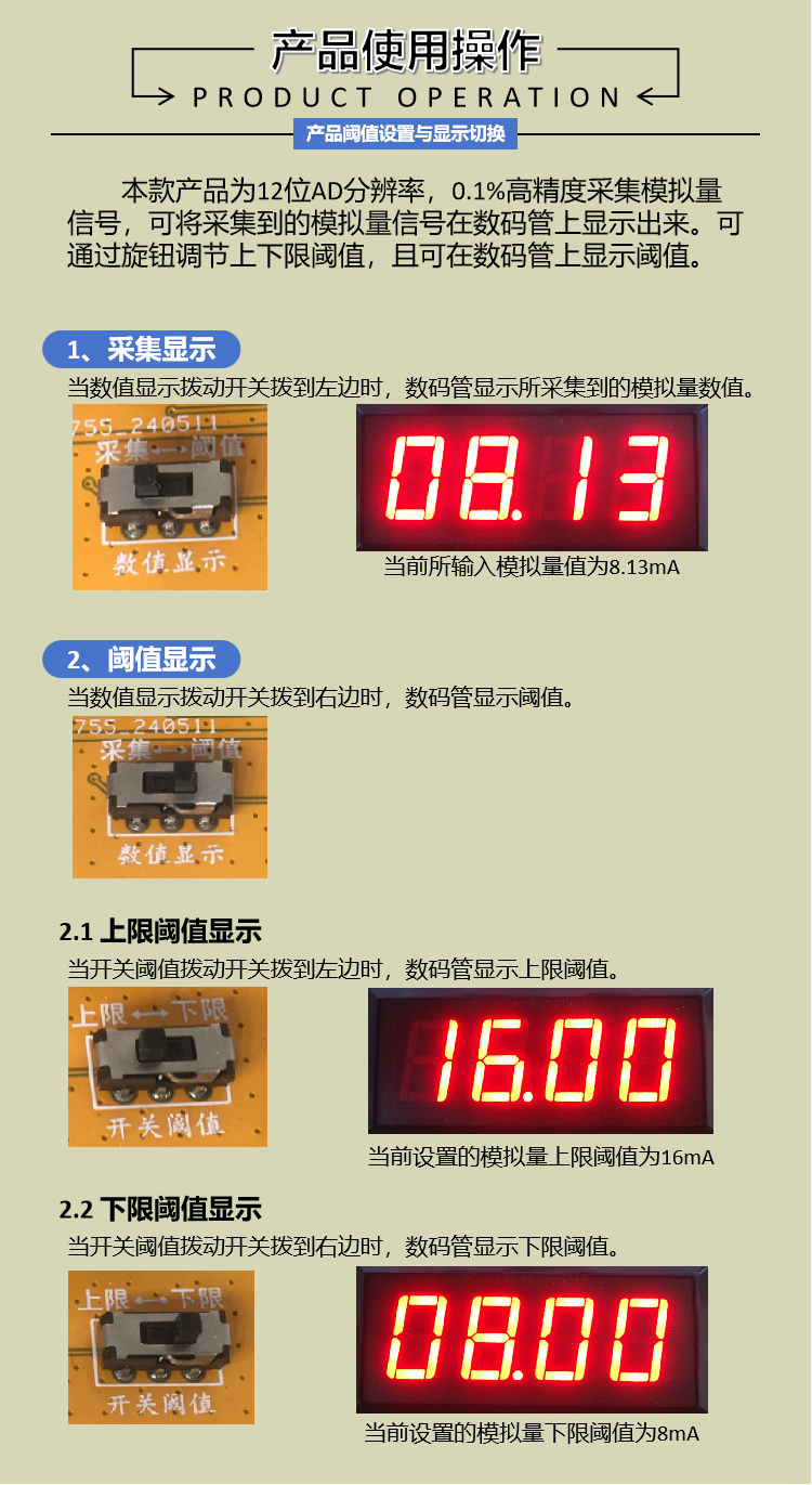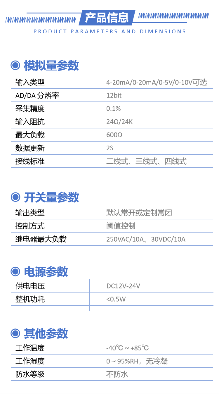 模拟量转开关量模块,当输入的模拟量大于或者小于设定的阈值时,输出端的开关就会闭合或者断开。可用旋钮设置阈值,带数码管显示,拨码开关切换输入值和设置阈值,拨码开关切换输入类型,支持0-20mA和0-10V模拟输入,继电器默认常开输出,最大负载可达10A。