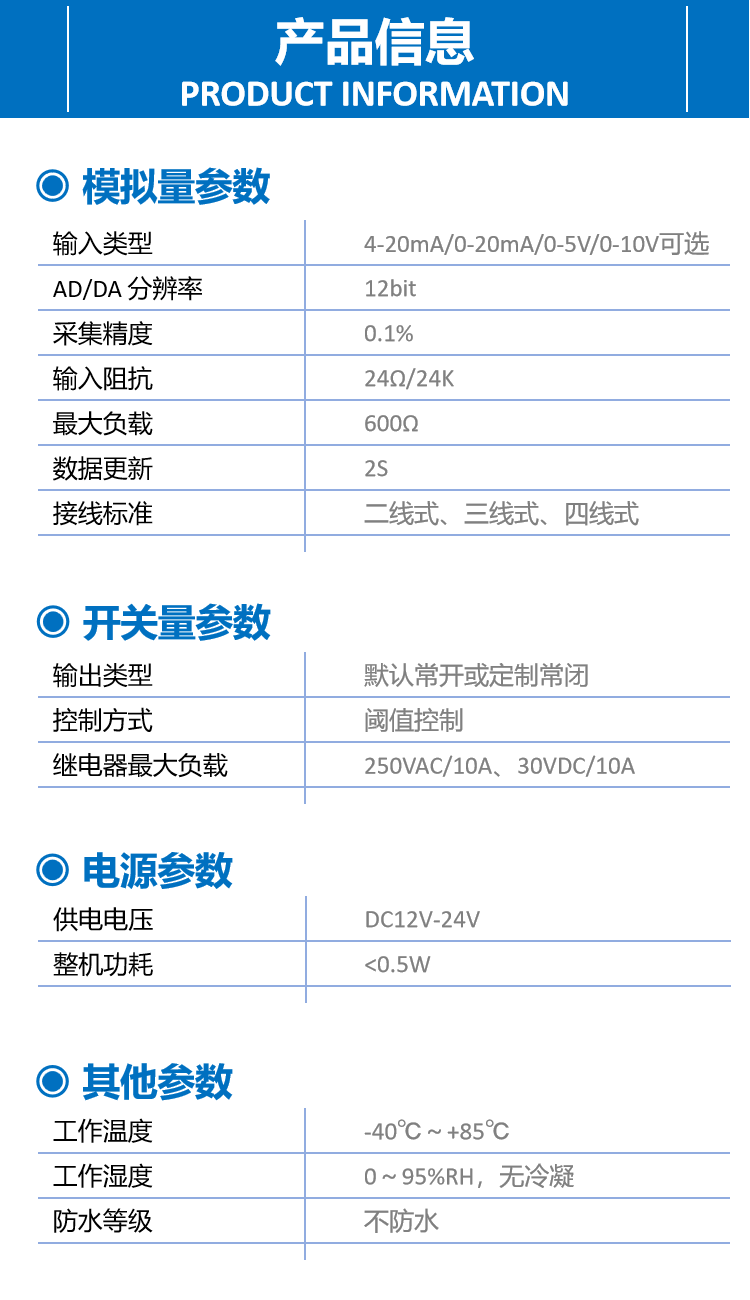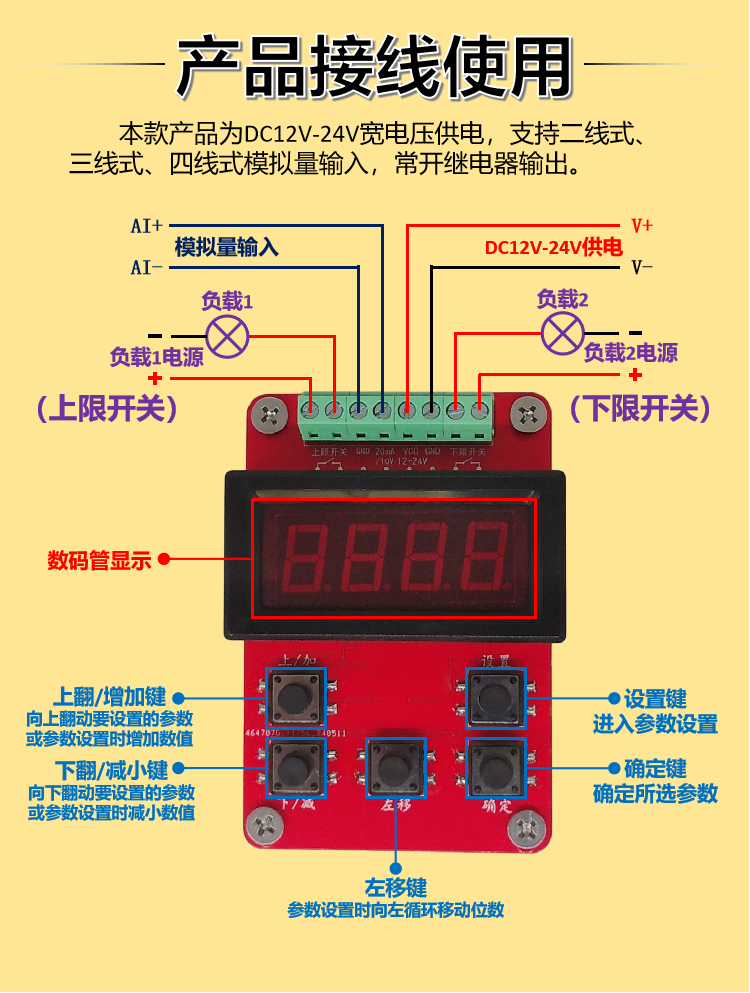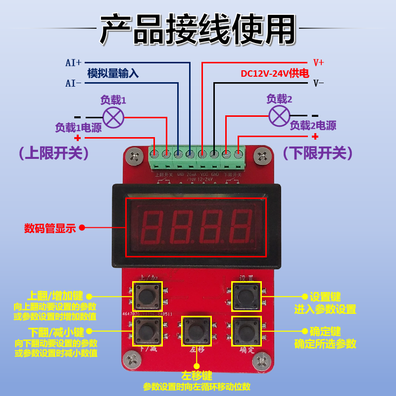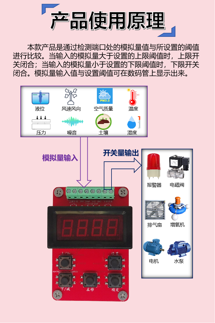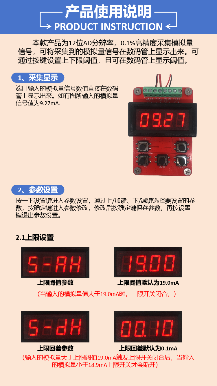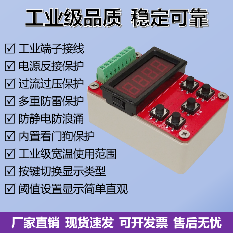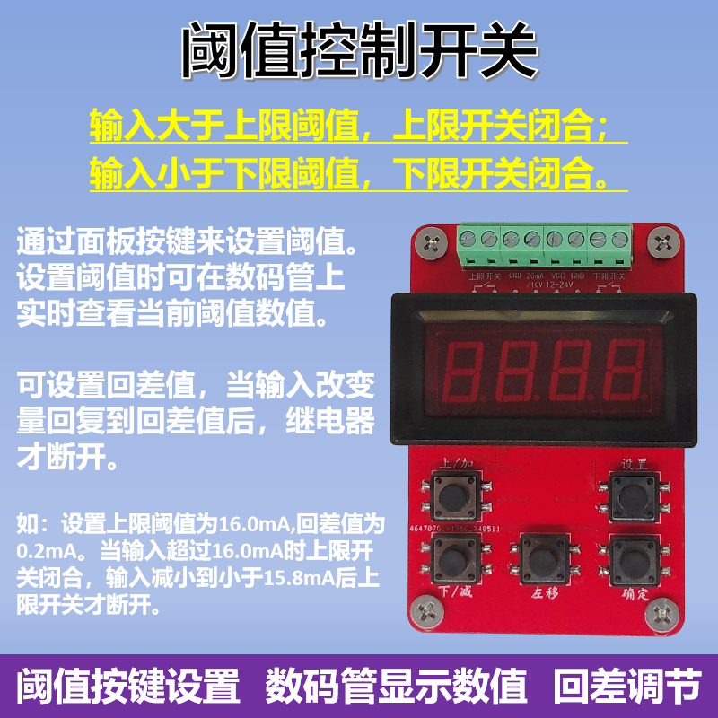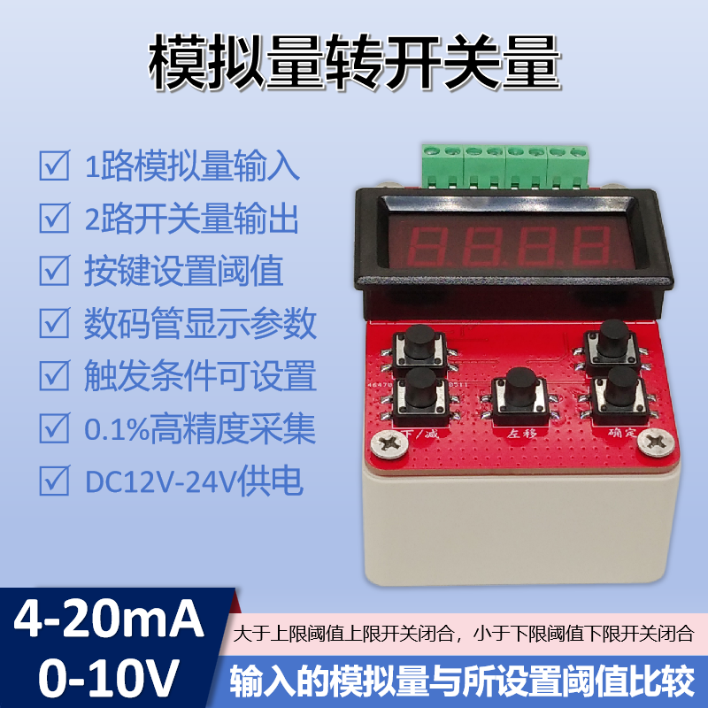模拟量转开关量模块,当输入的模拟量大于或者小于设定的阈值时,输出端的开关就会闭合或者断开。可用按键设置阈值,回差等参数。带数码管显示,拨码开关切换输入值和设置的阈值,拨码开关切换输入类型,支持0-20mA和0-10V模拟输入,继电器默认常开输出,最大负载可达10A。