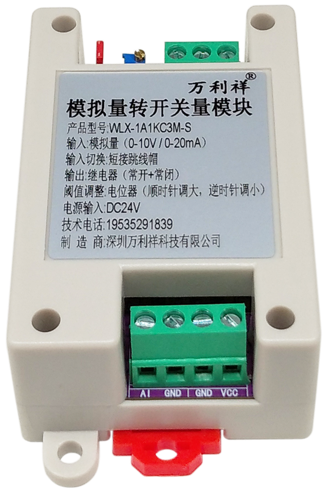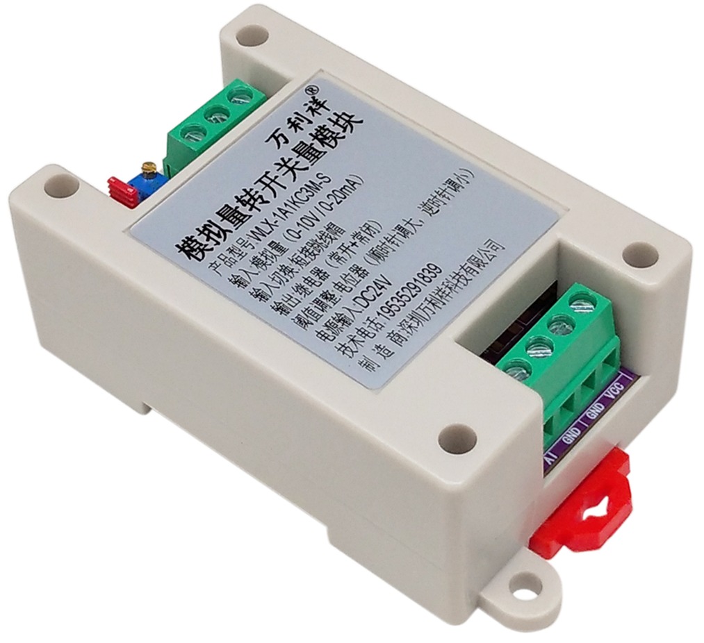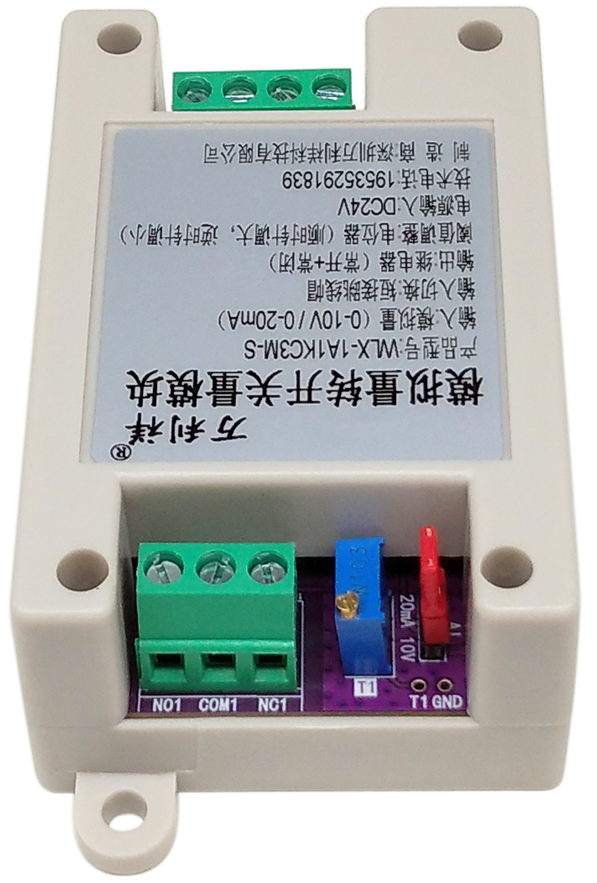 模拟量转开关量模块,当输入的模拟量大于或者小于设定的阈值时,输出端的开关就会闭合或者断开。可用电位器调节设置阈值,设备带有阈值测试点,可用万用表测量换算当前阈值。支持0-20mA和0-10V模拟量输入,短接帽切换输入类型,免拆壳使用,简单方便。继电器常开和常闭输出,最大负载可达10A。