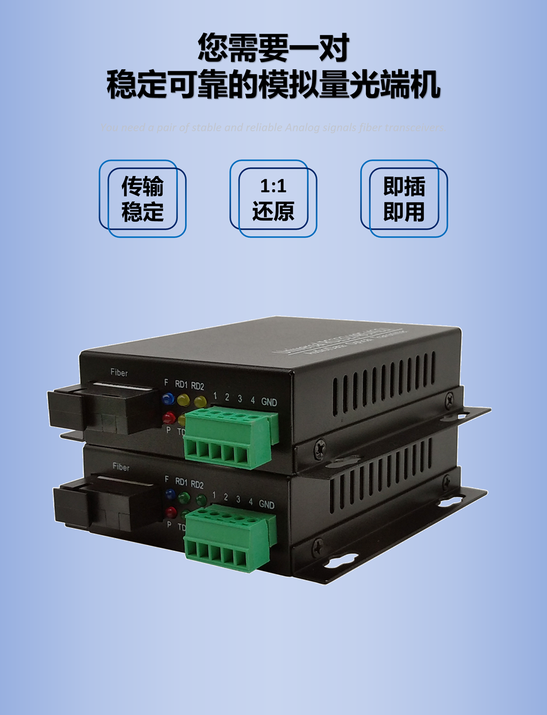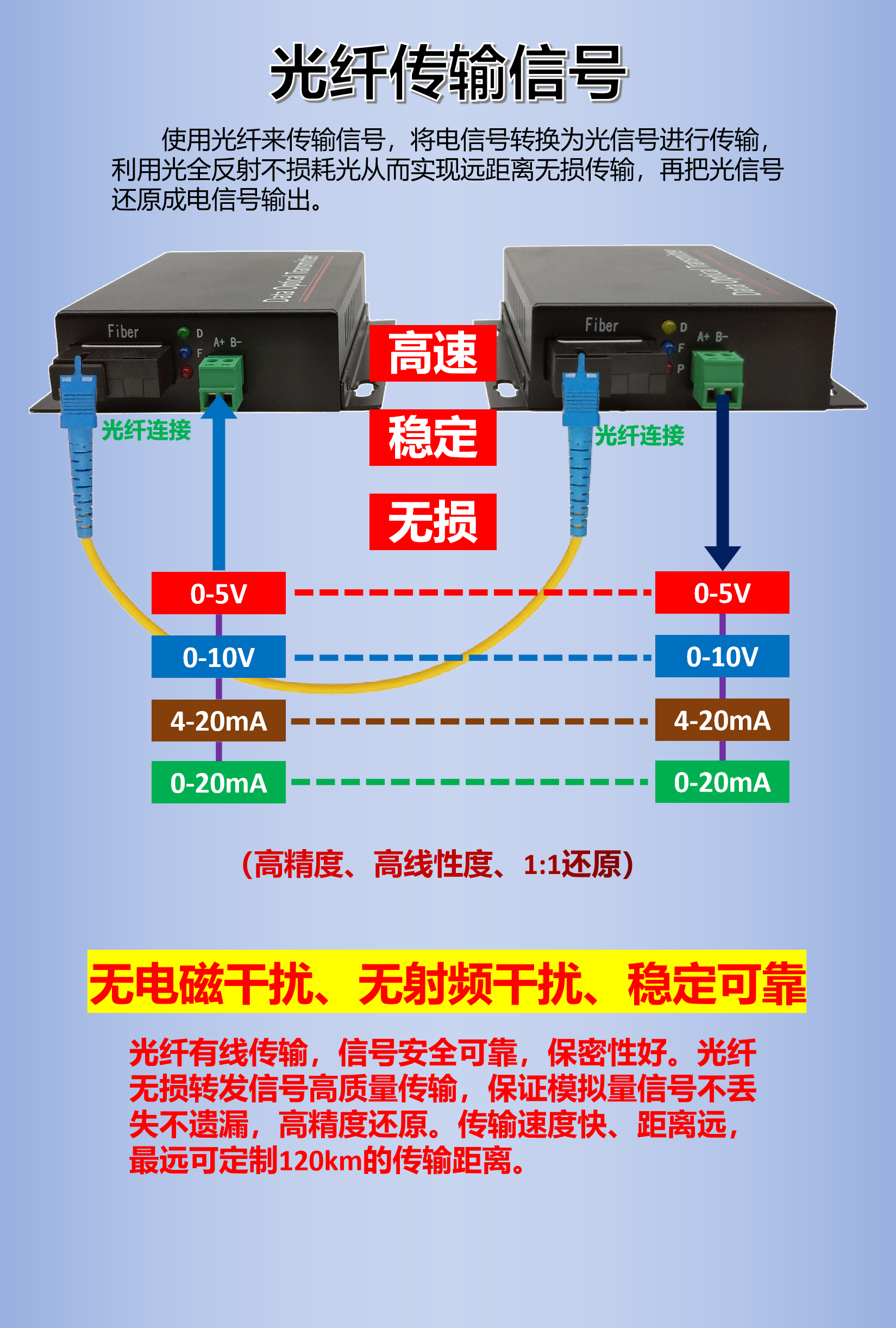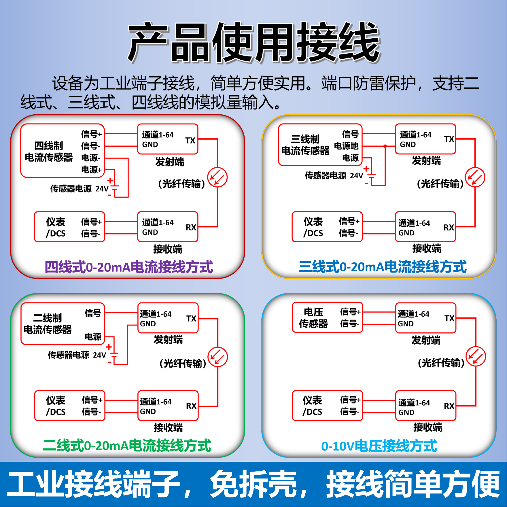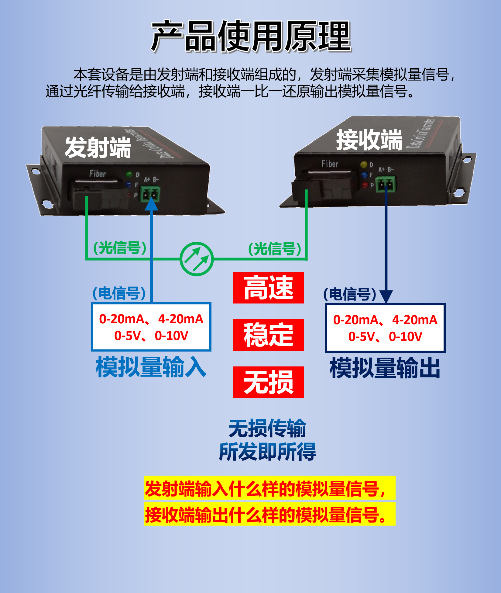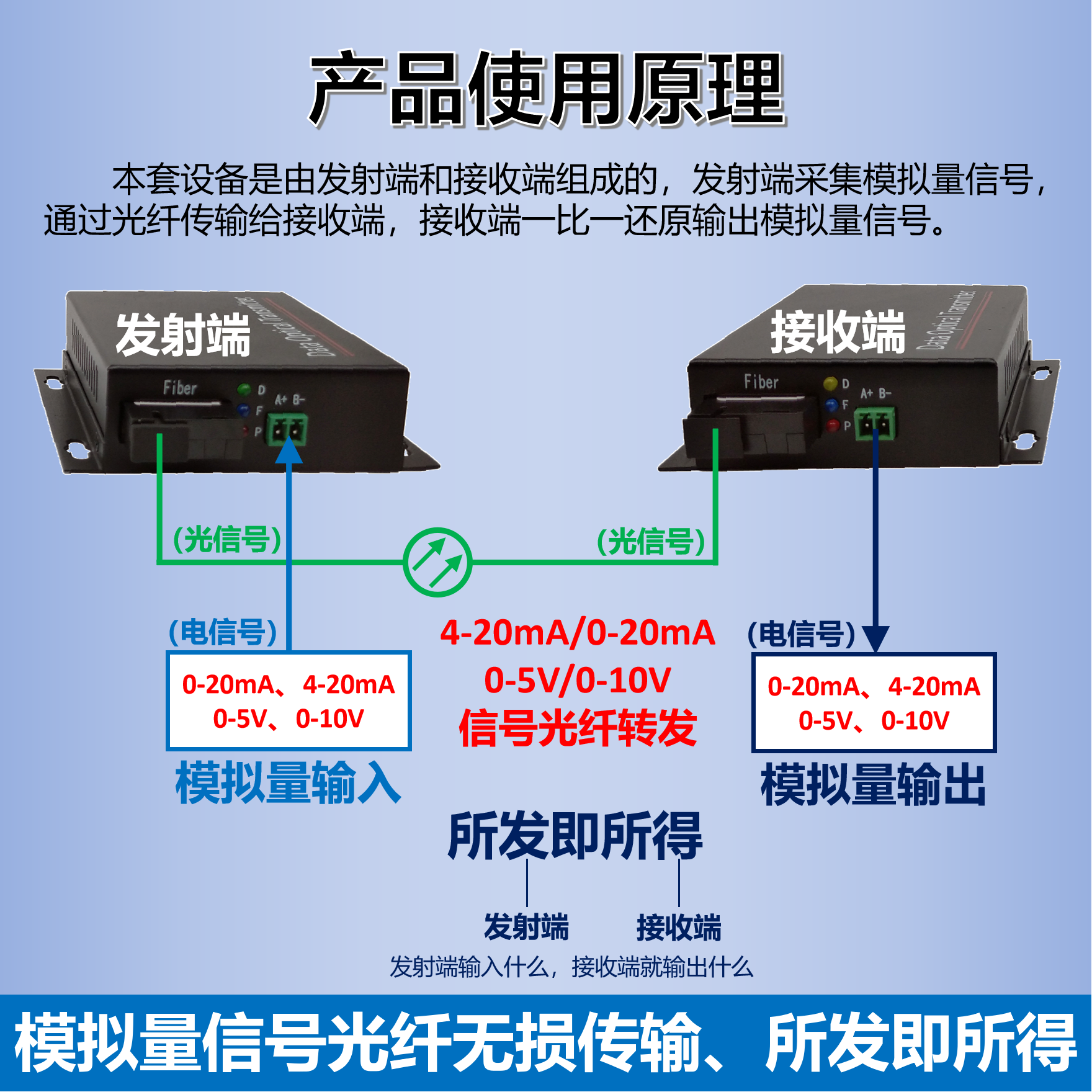 本套设备是由发射端和接收端组成的,发射端高精度采集模拟量信号,通过光纤无损远距离传输给接收端,接收端一比一还原输出模拟量信号。