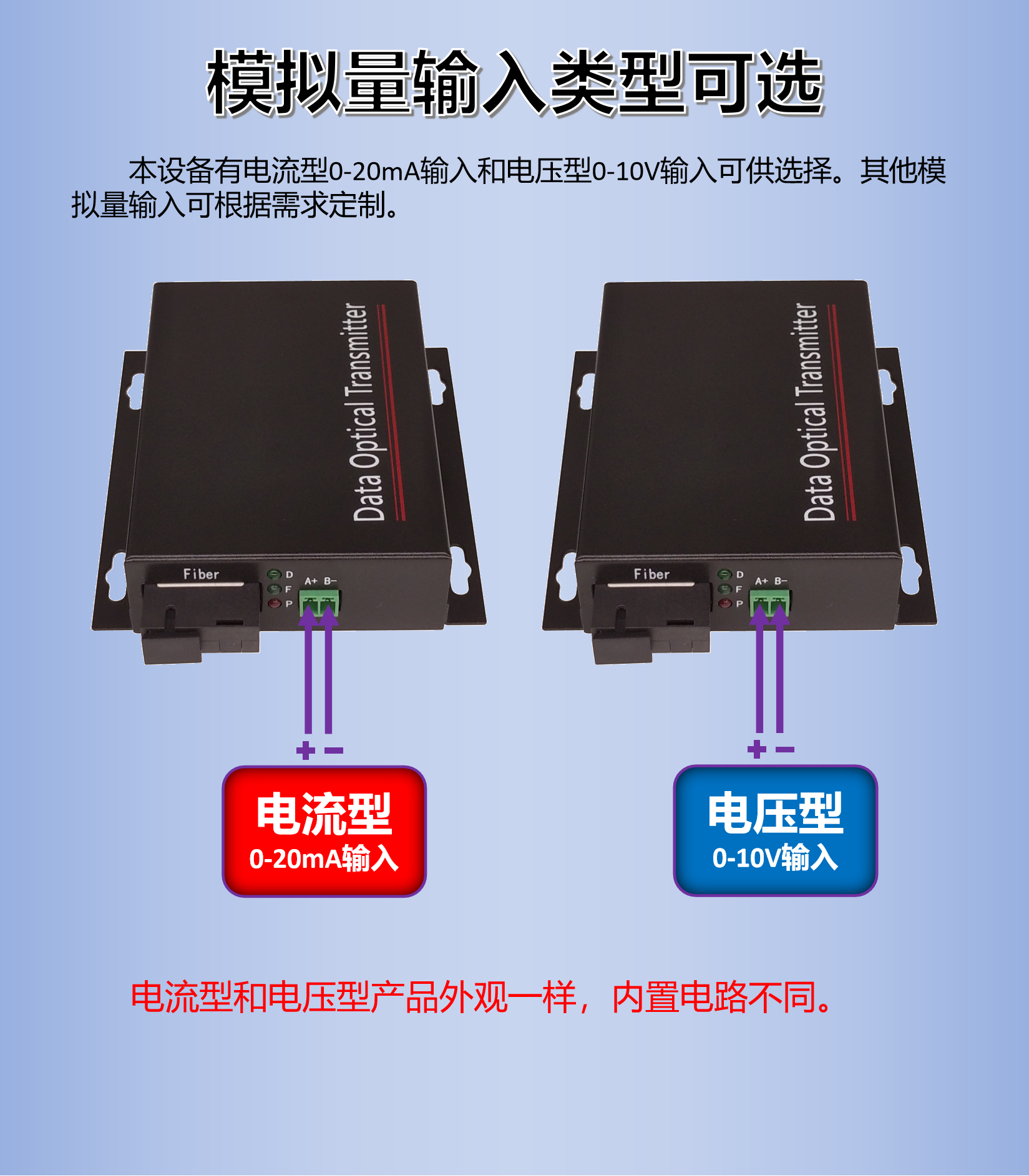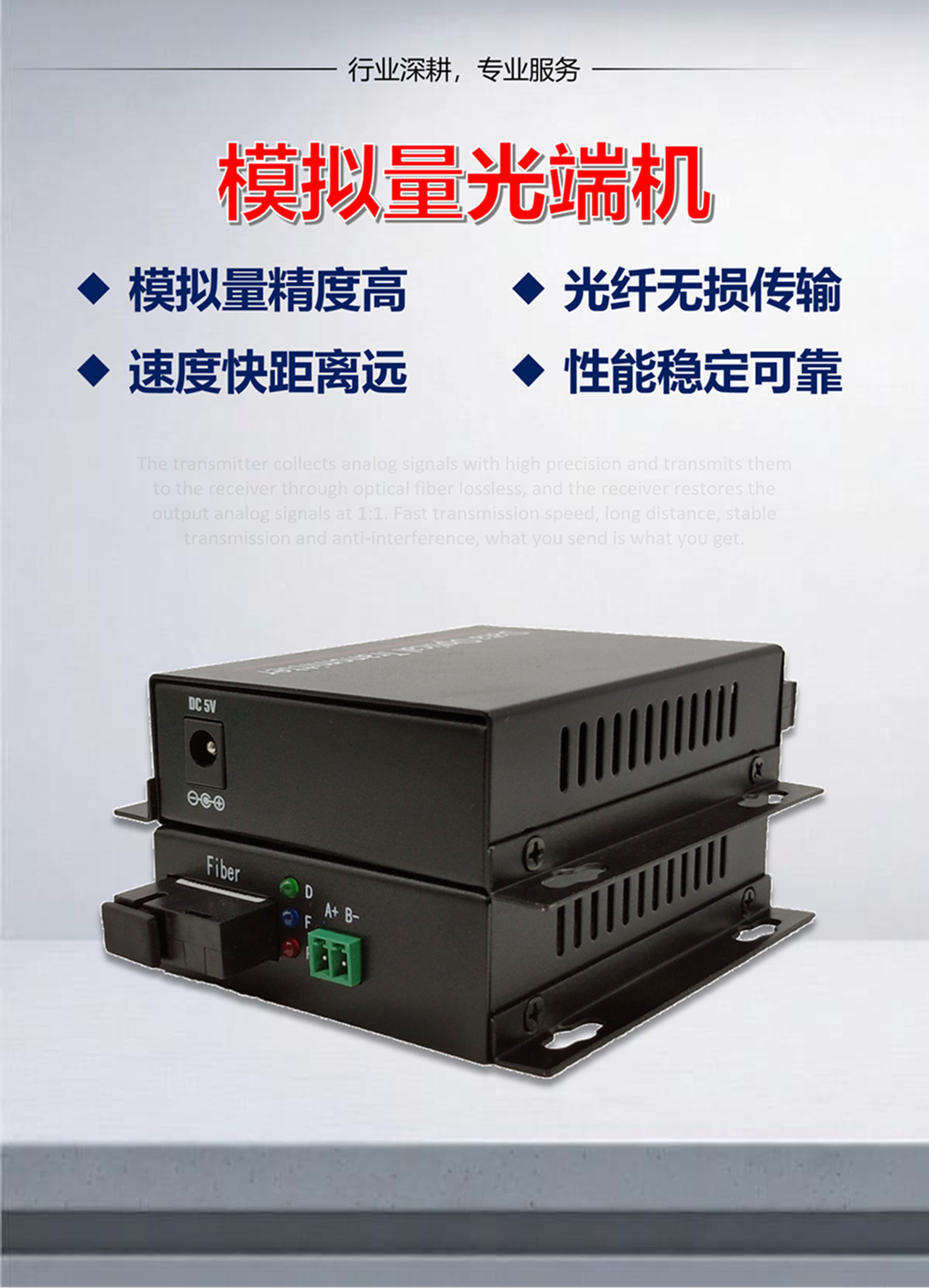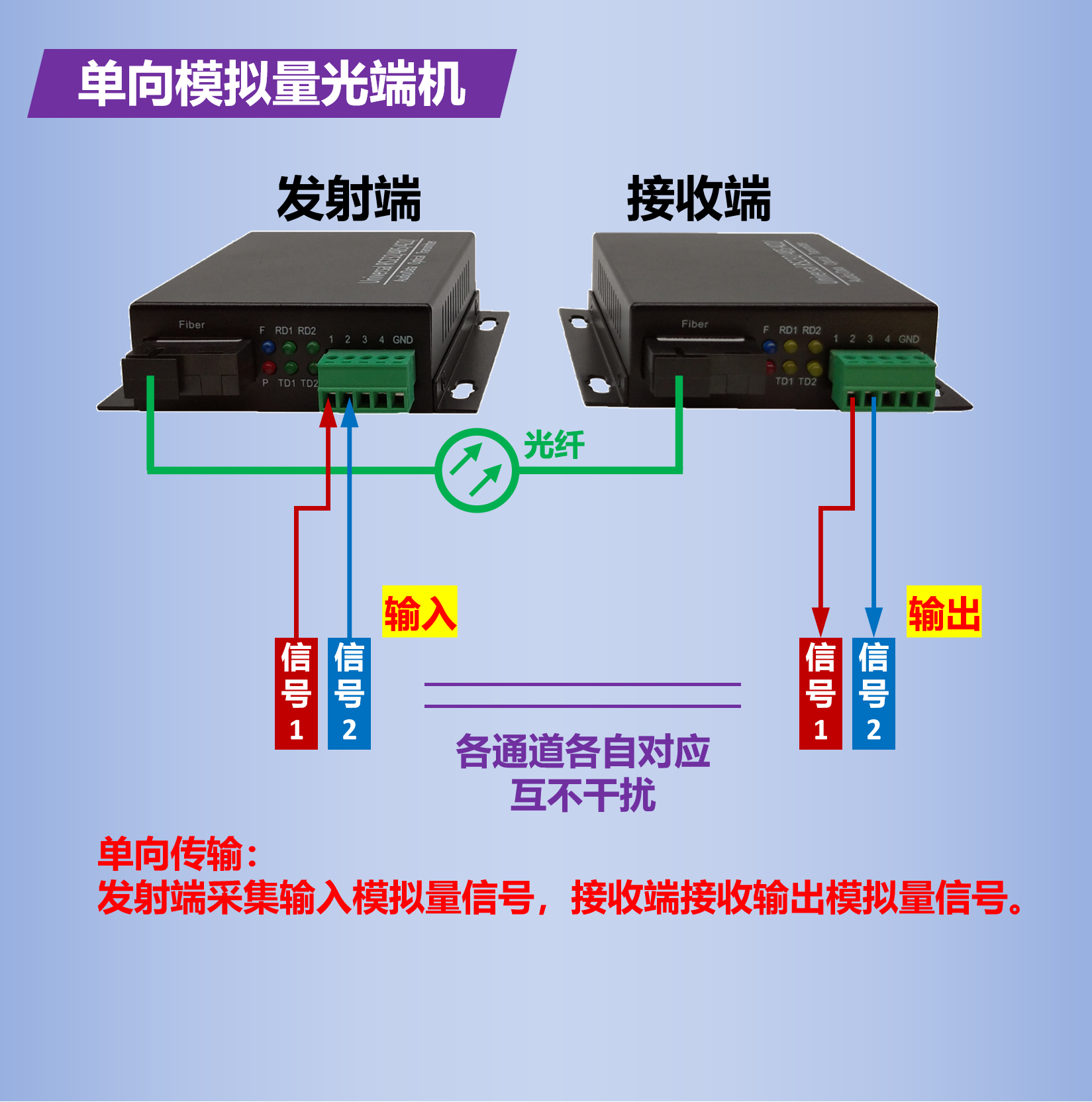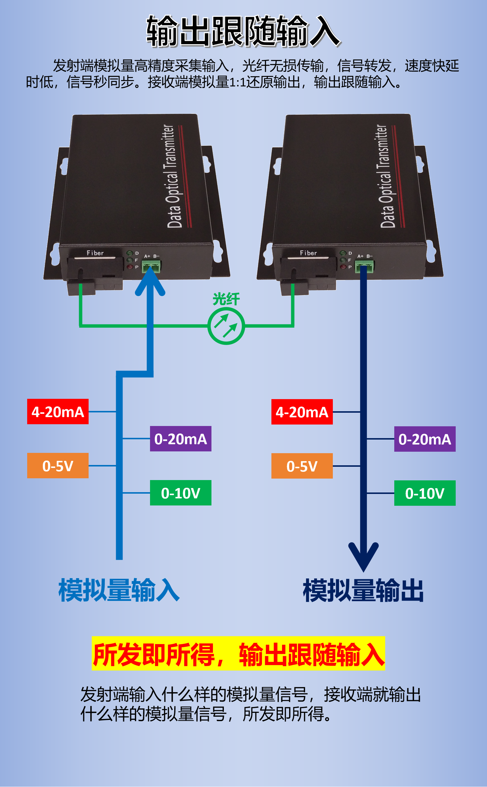本套设备是由发射端和接收端组成的,发射端高精度采集模拟量信号,通过光纤无损远距离传输给接收端,接收端一比一还原输出模拟量信号。