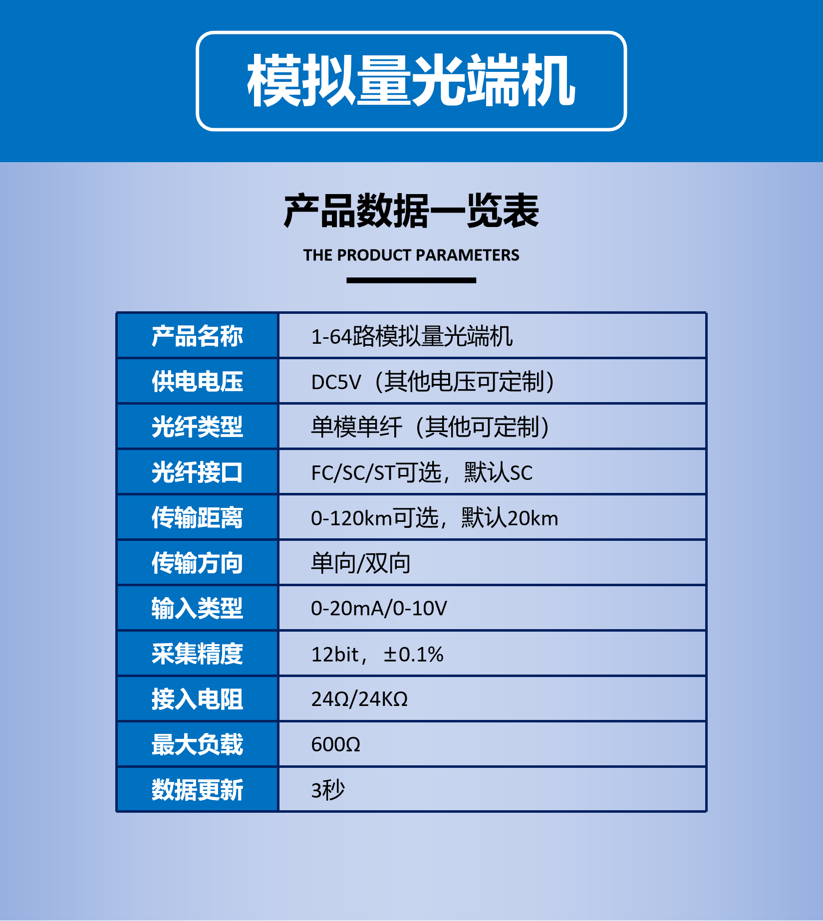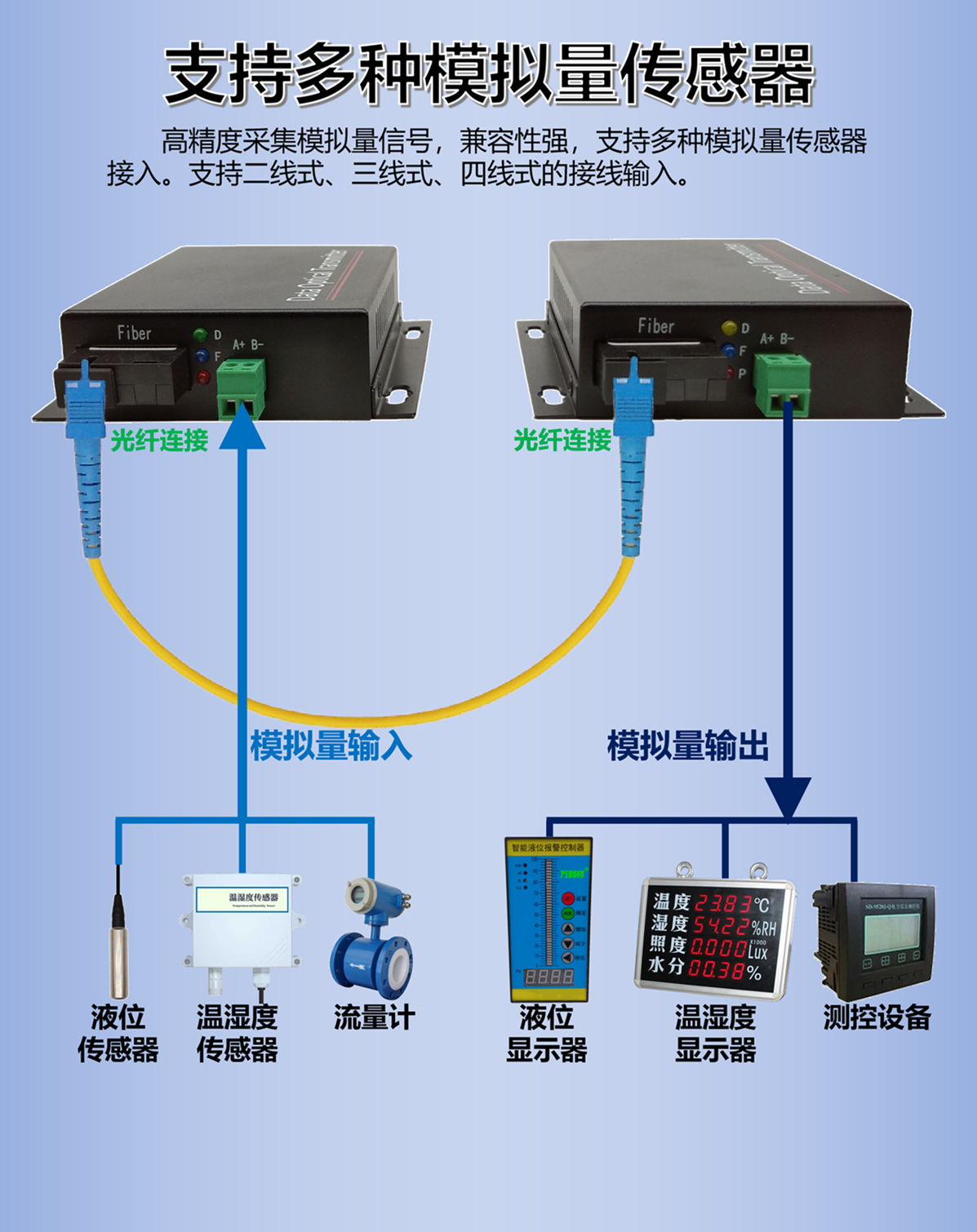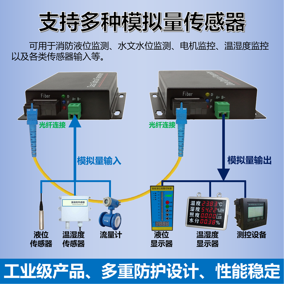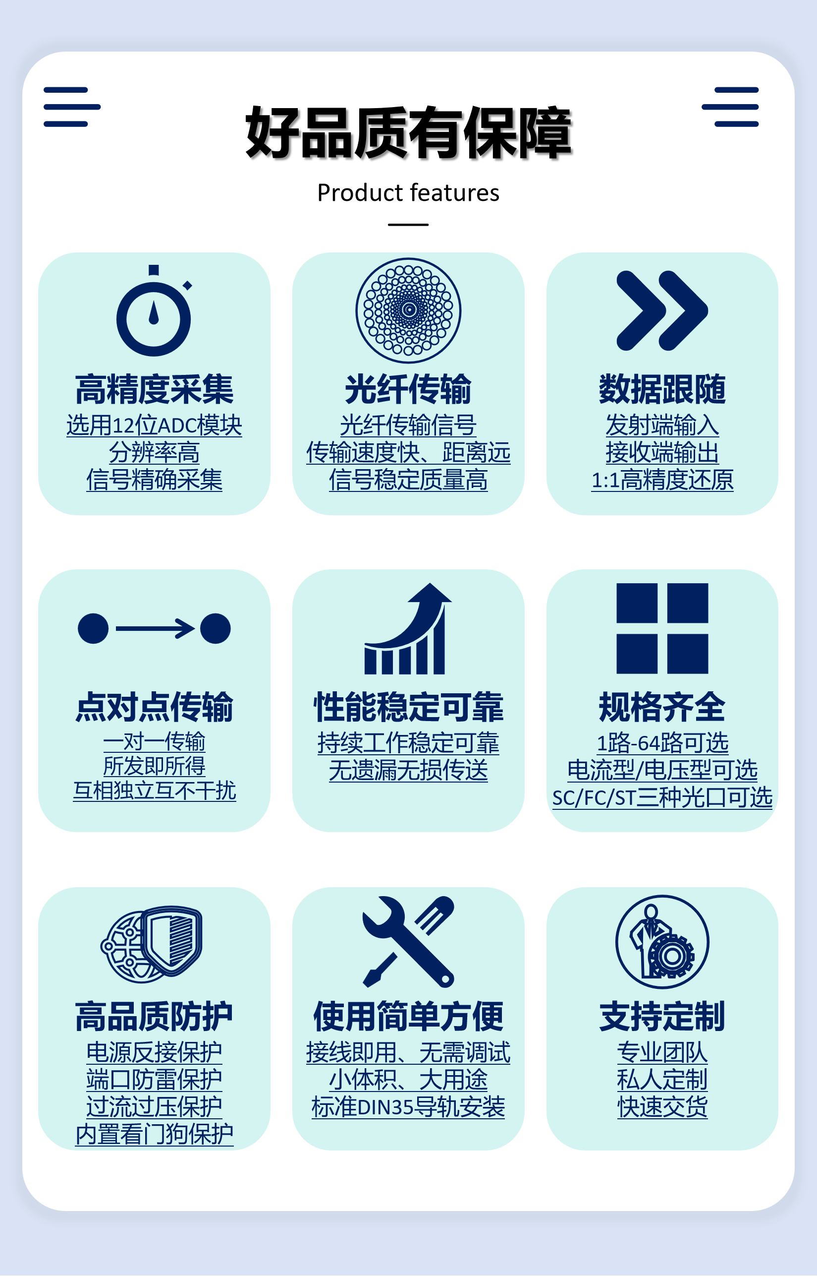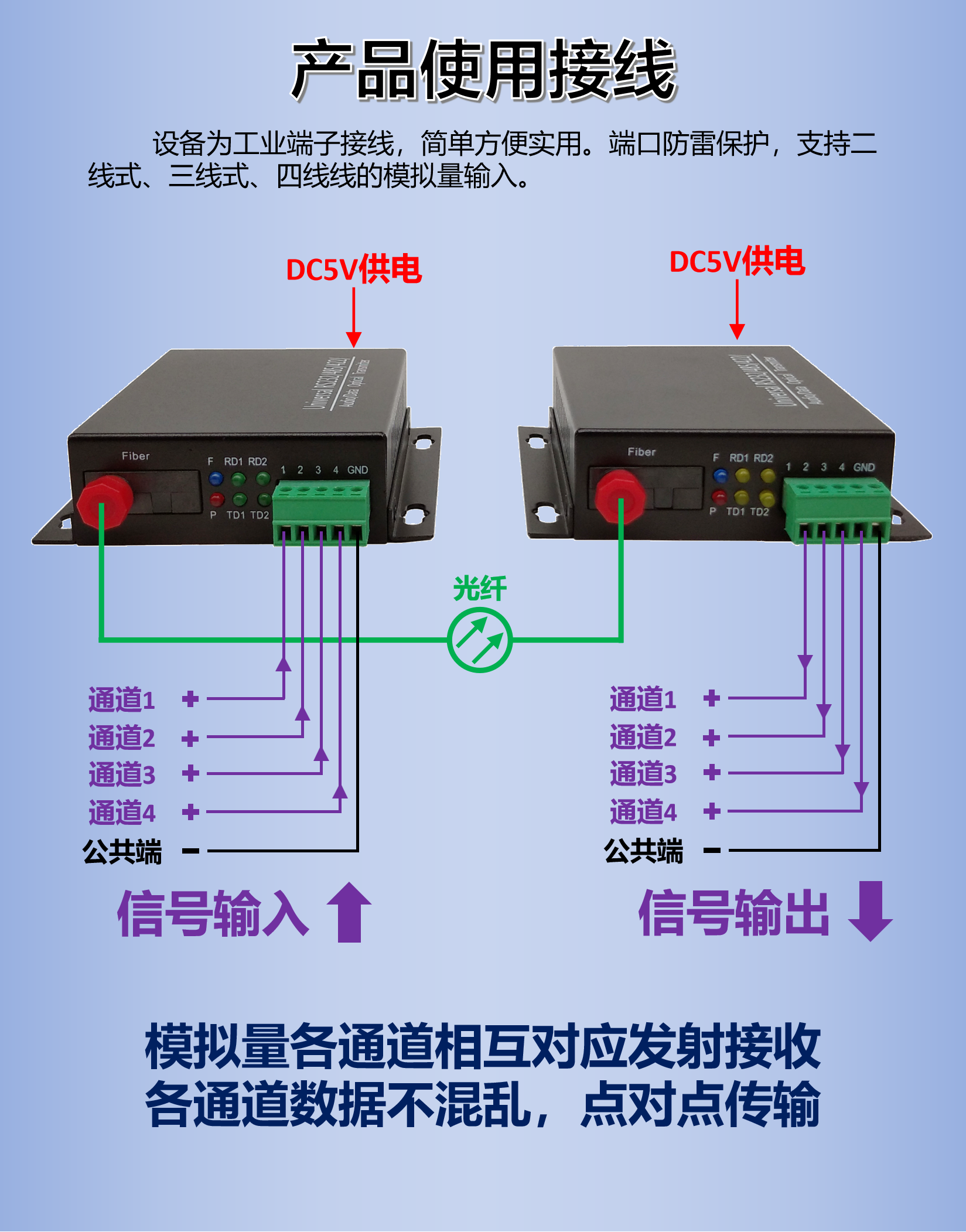本套设备是由发射端和接收端组成的,发射端高精度采集模拟量信号,通过光纤无损远距离传输给接收端,接收端一比一还原输出模拟量信号。