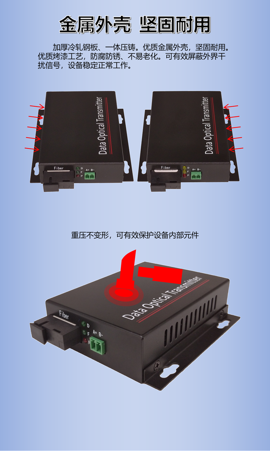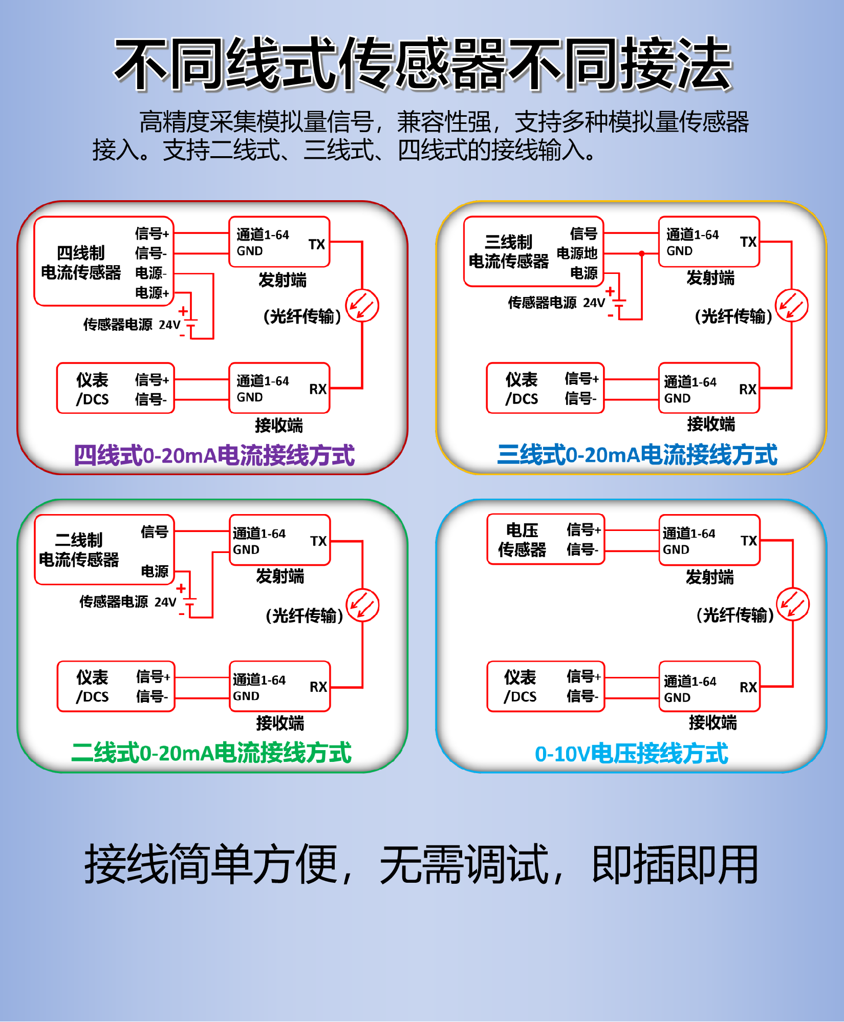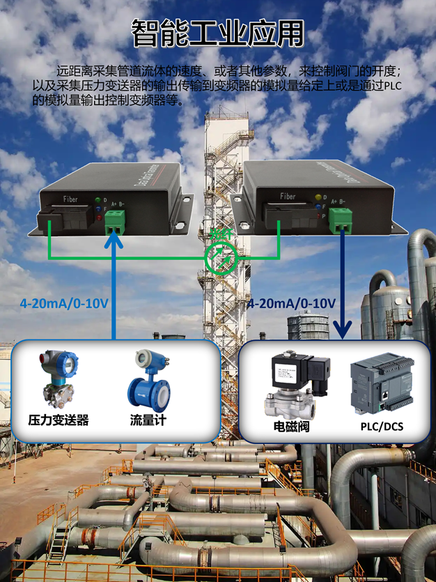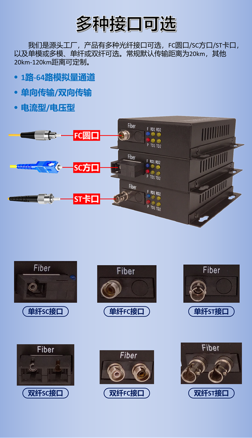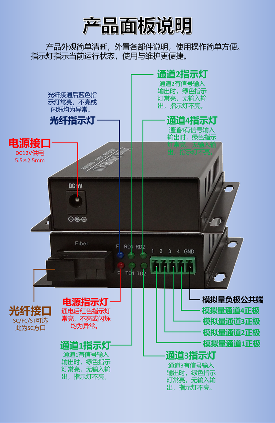 本套设备是由发射端和接收端组成的,发射端高精度采集模拟量信号,通过光纤无损远距离传输给接收端,接收端一比一还原输出模拟量信号。
