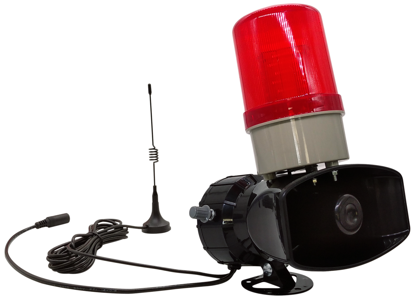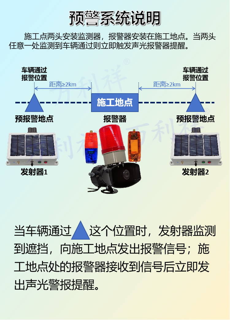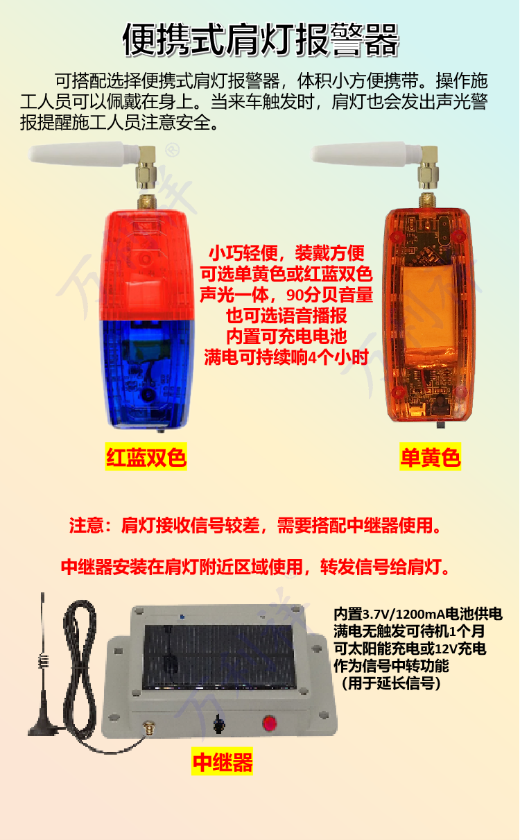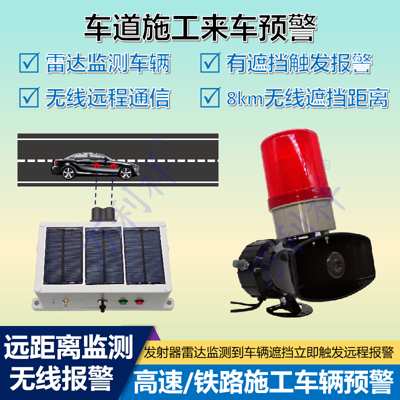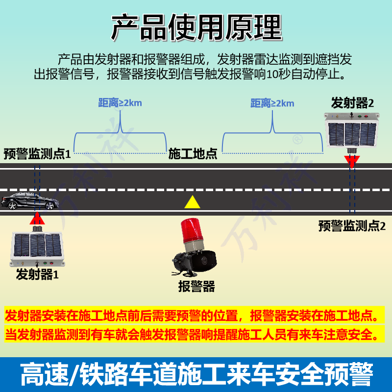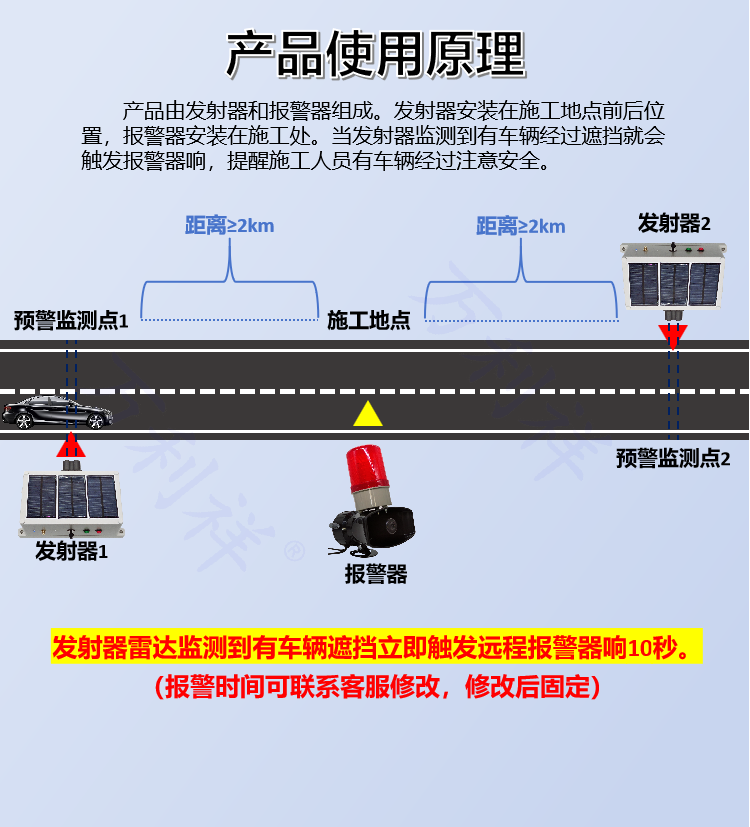 产品由发射器和报警器组成,发射器雷达监测到遮挡发出报警信号,报警器接收到信号触发报警响。