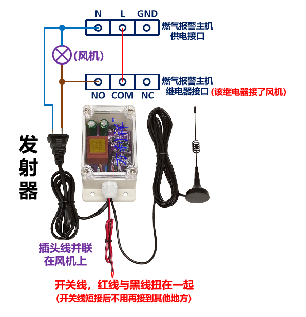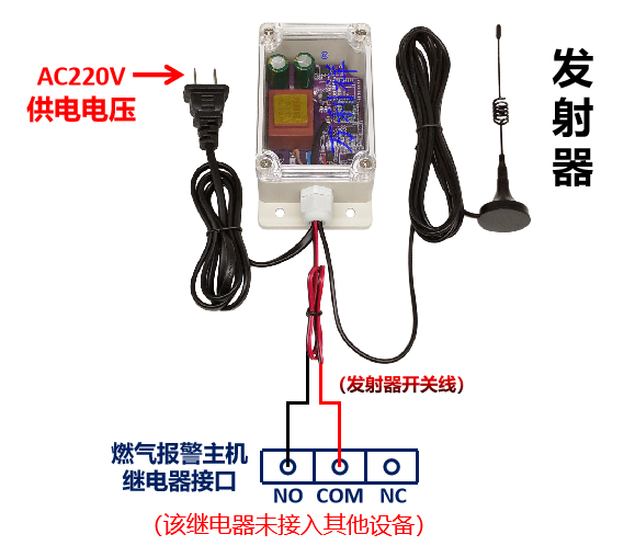 产品发射端安装在监测目标位置,发射端开关引线接入被监测开关量信号;产品接收端安装在所需要报警的位置。当发射端监测到开关闭合,声光报警器即报警。若选配有手柄遥控器,可以使用遥控器开启/关闭报警。