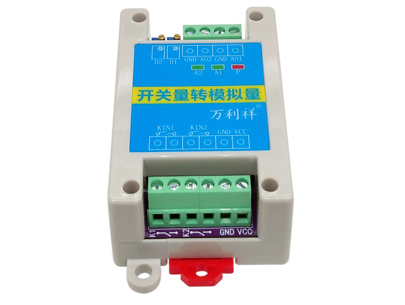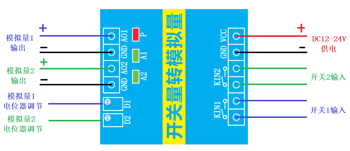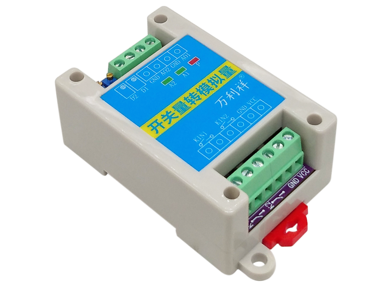 2路开关量转2路模拟量模块实现对2路继电器开关的断开-闭合状态采集,从而转换为对应2路模拟量通道的0-20mA电流输出。