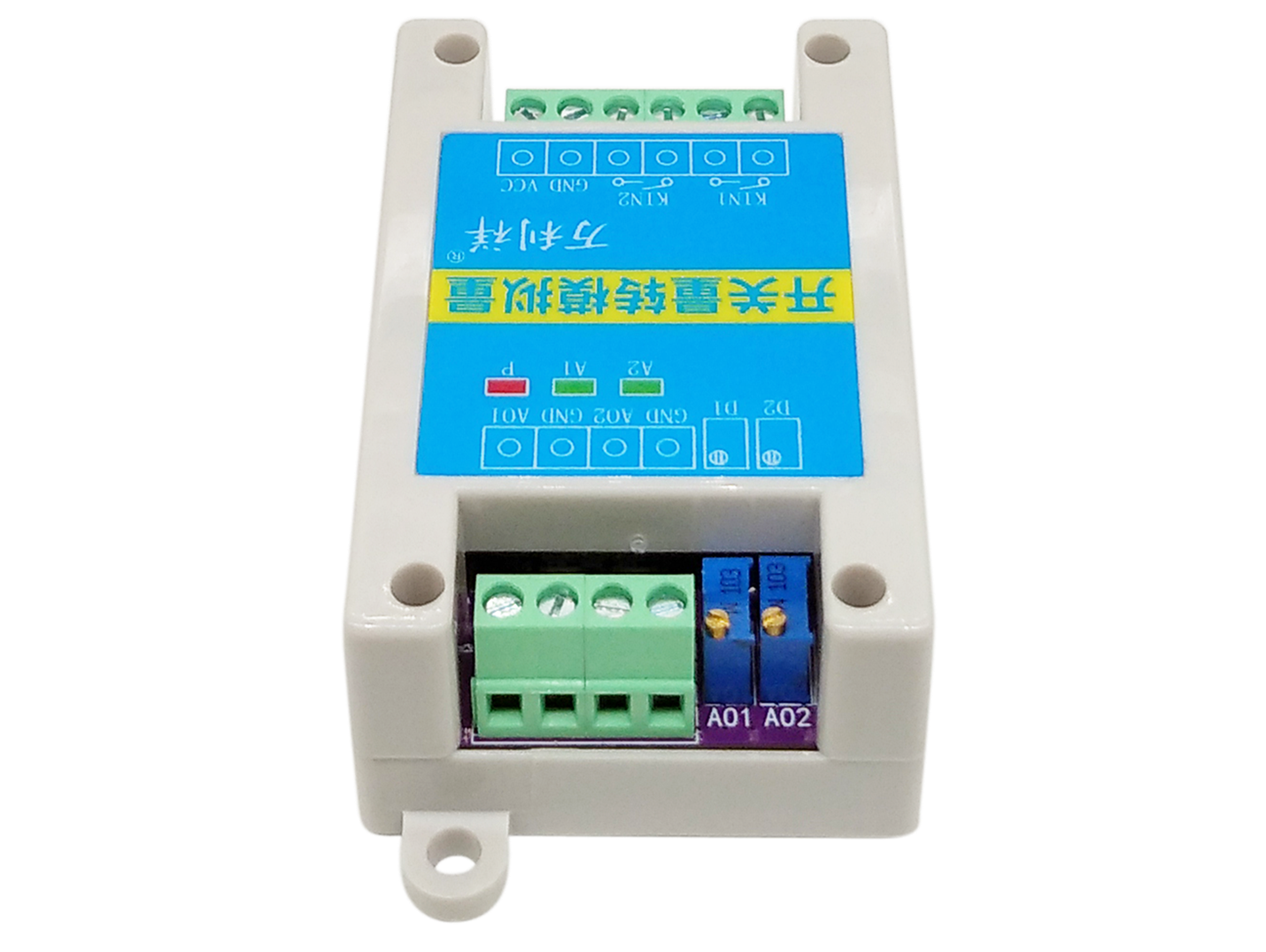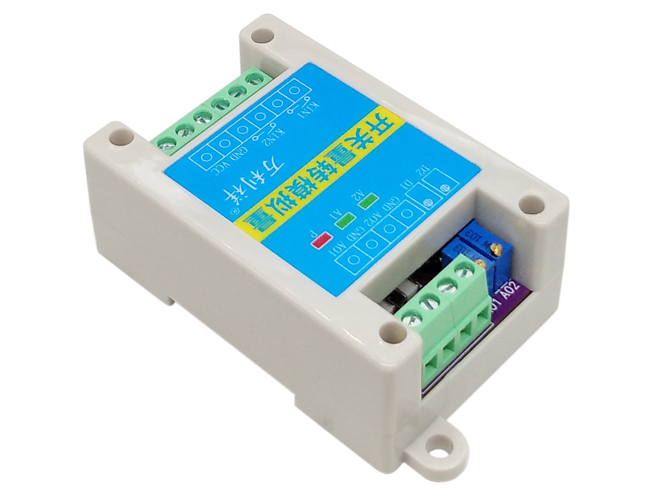 (2)KIN1继电器开关闭合,模拟量通道AO1输出10mA电流(默认10mA,具体大小可通过电位器D1自行调节);