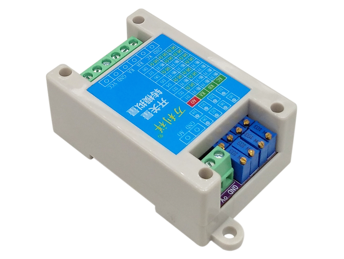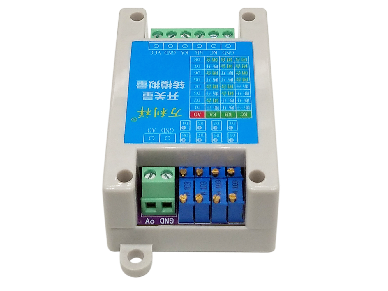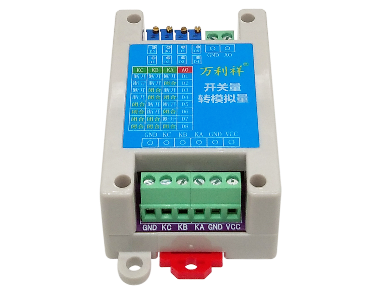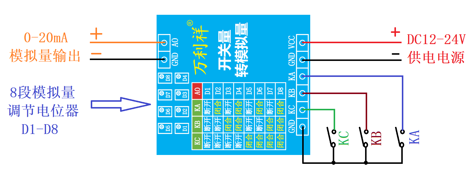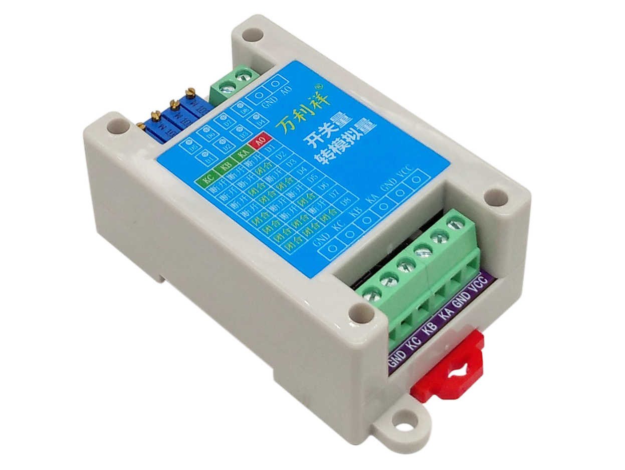3路开关量转8段模拟量输出模块通过对3路继电器开关的断开-闭合状态采集,从而转换为对应8段不同的电流输出,8段电流的大小可通过8个电位器调节。