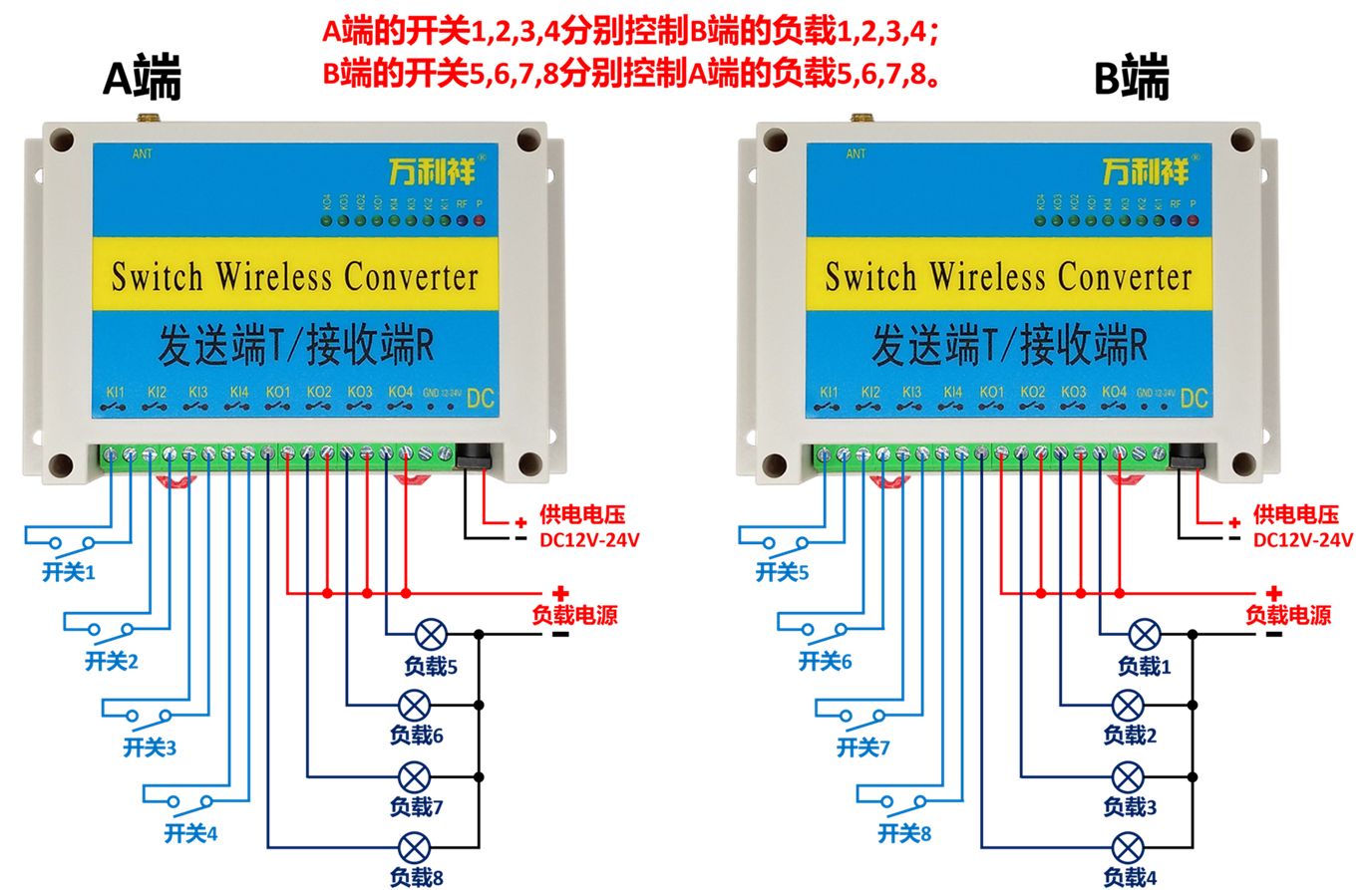 本套设备是由发射端和接收端组成的。发射端监测端口开关状态,将开关信号通过无线的方式传输到接收端;接收端收到信号后响应对应的动作。发射端开关闭合,接收端开关也闭合。开关无线远程同步。